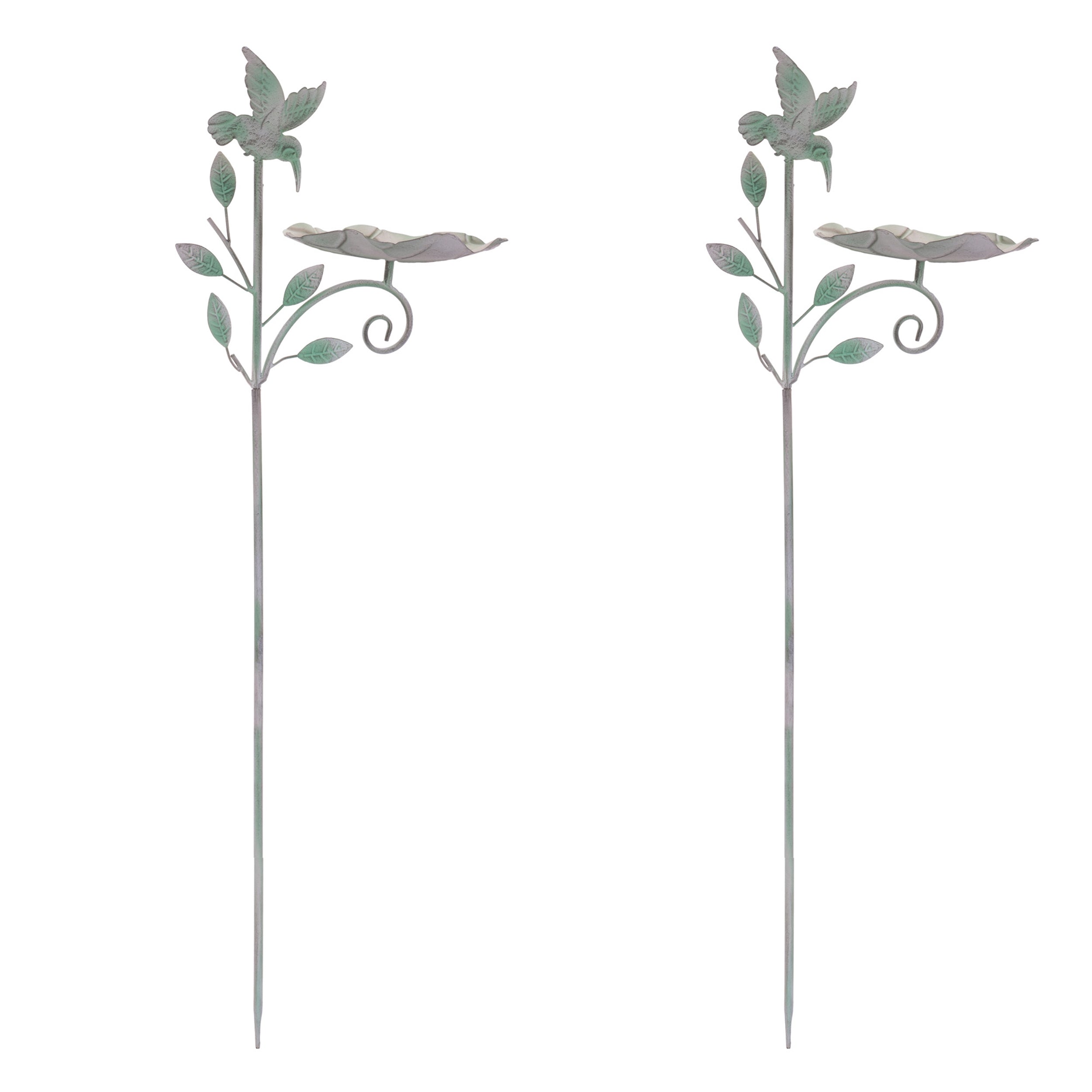 Whimsical Garden Charm: Includes two coordinated stakes with leaf bowls and sculpted hummingbird accents.