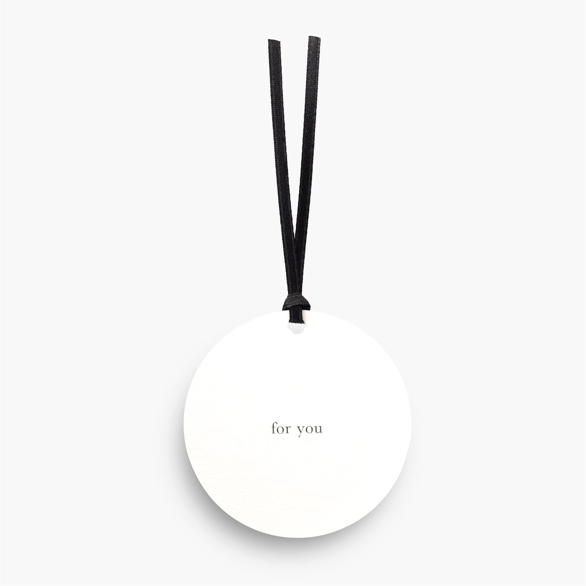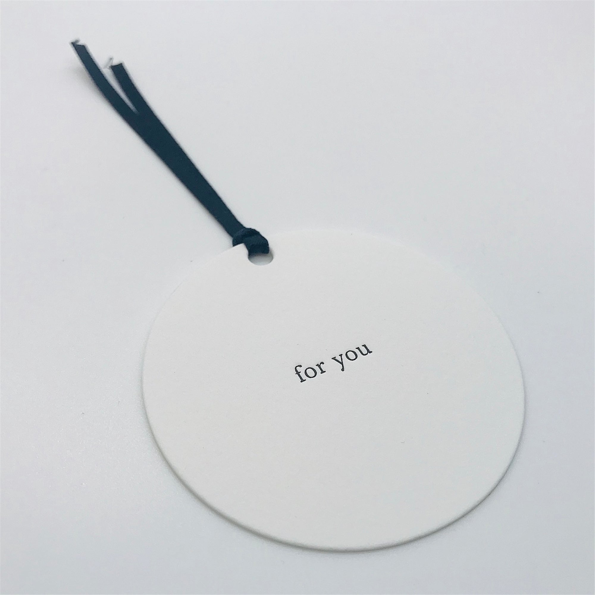 Circular gift tags offer letterpress expressions on brilliant white 184 lb cotton cardstock with attached black ribbon. Packaged Individually.