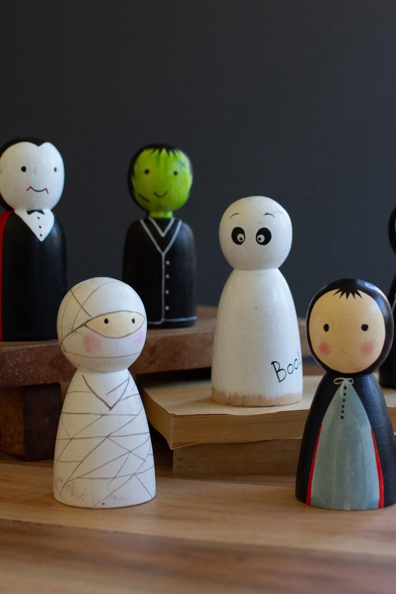 The gang's all here! Vampire, Mummy, and More make up this merry scary band! Snag this set of six wooden Halloween figures for your next event.
