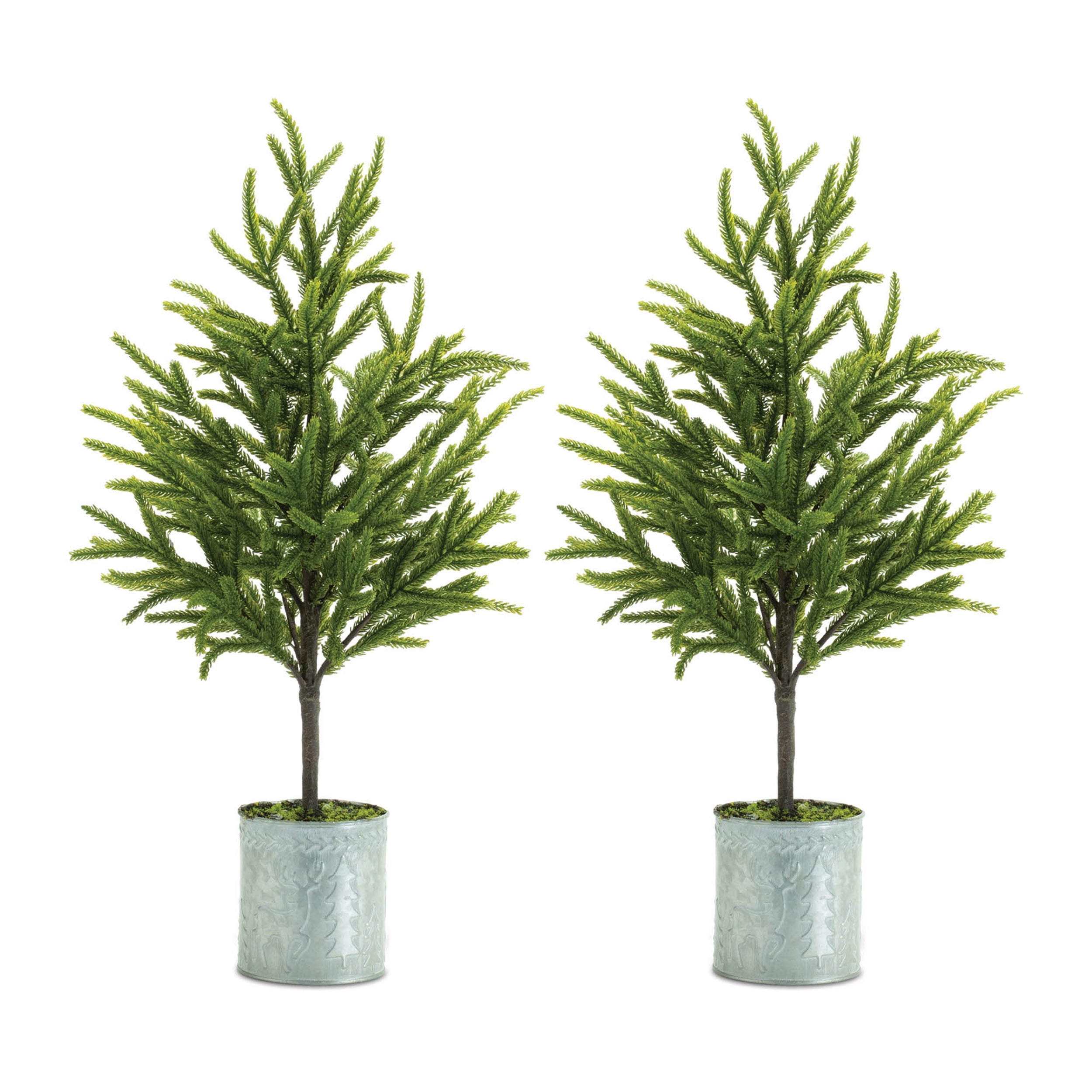 Add a touch of natural holiday charm to your decor with this set of two Potted Mini Pine Trees. Featuring earthy green tones and a classic pine tree shape, these mini trees are nestled in trendy galvanized metal planters adorned with deer and pine tree accents for a rustic holiday feel. The wired branches allow for easy shaping, making them perfect for creating a cozy seasonal display. Ideal for entryways, mantels, shelves, or alongside holiday figurines, these versatile trees bring festive warmth to any space.