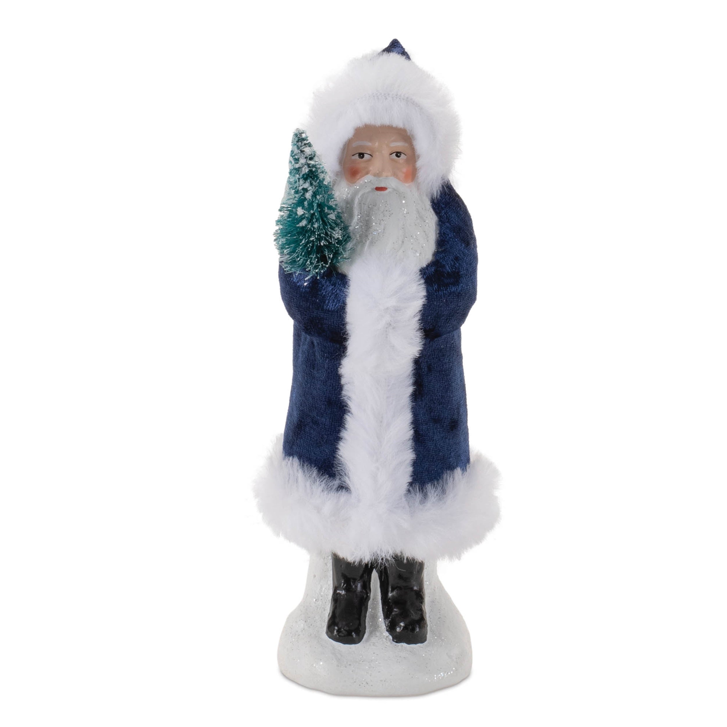Add a fresh twist to your holiday décor with this Set of 2 Blue & White Santa Figurines. Made from lightweight paper pulp, these 8-inch tall Santas bring a whimsical charm to mantels, shelves, or tabletops. Dressed in rich navy blue with white trim and holding a festive green tree, these vintage-inspired figures blend traditional spirit with modern color for a standout seasonal accent.