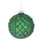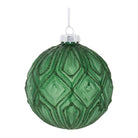 Add a touch of modern holiday cheer to your décor with these Glitter Frosted Glass Ball Ornaments. Featuring wintry green tones and glittered accents, these traditional ball-shaped ornaments boast a geometric texture and a frosted glass finish that adds an elegant touch to your Christmas tree. Each ornament comes with a delicate string hanger and a silver ornament cap, perfect for hanging on branches, wreaths, or garlands. Sold in a set of 12 pieces with two assorted designs, these ornaments will enhance any seasonal display with their stylish and festive flair.
