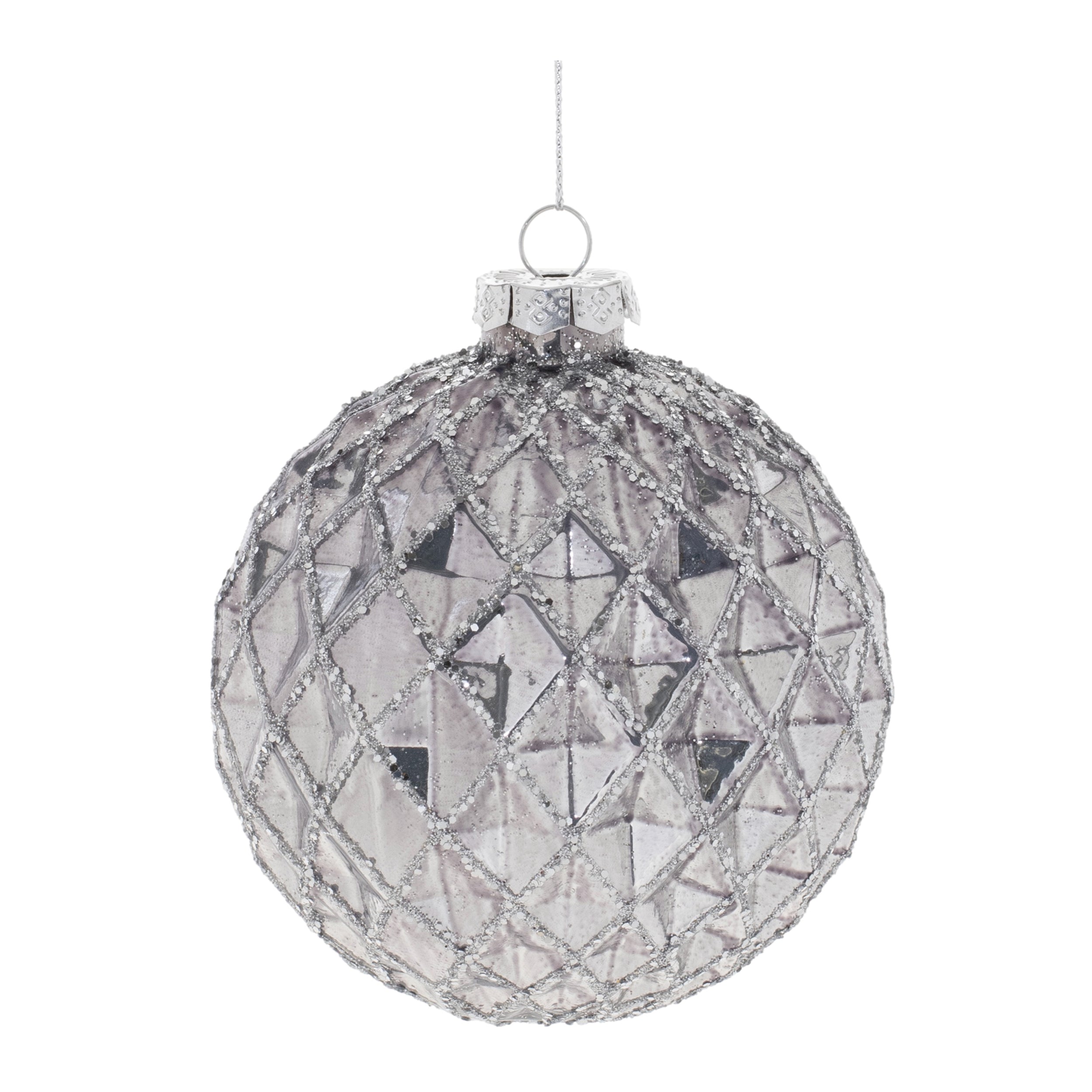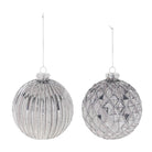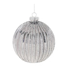 Bring modern holiday cheer to your seasonal décor with these Glittered Glass Ball Ornaments. Featuring wintry silver tones with glittered touches and a metallic finish, these ornaments offer a luxurious sparkle. The traditional ball shape is enhanced with intricate ribbed and harlequin textures, creating a stylish, sophisticated design. A delicate string hanger and silver ornament cap complete the look, making them perfect for your Christmas tree, wreath, or mantle garland. Sold in a set of 6 pieces with two assorted designs, these ornaments will make a stunning statement in any holiday display.