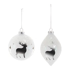Bring a rustic, woodland charm to your Christmas decor with the Glittered Glass Deer Ornaments. Featuring wintry white tones with glittered and metallic silver accents, these traditional ball and oblong shapes showcase a rustic deer and pine design. Perfect for adding a touch of nature-inspired elegance to your Christmas tree, wreath, or mantle garland, these ornaments are sold in a set of 6 pieces with two assorted designs to complement your woodland-themed holiday display.