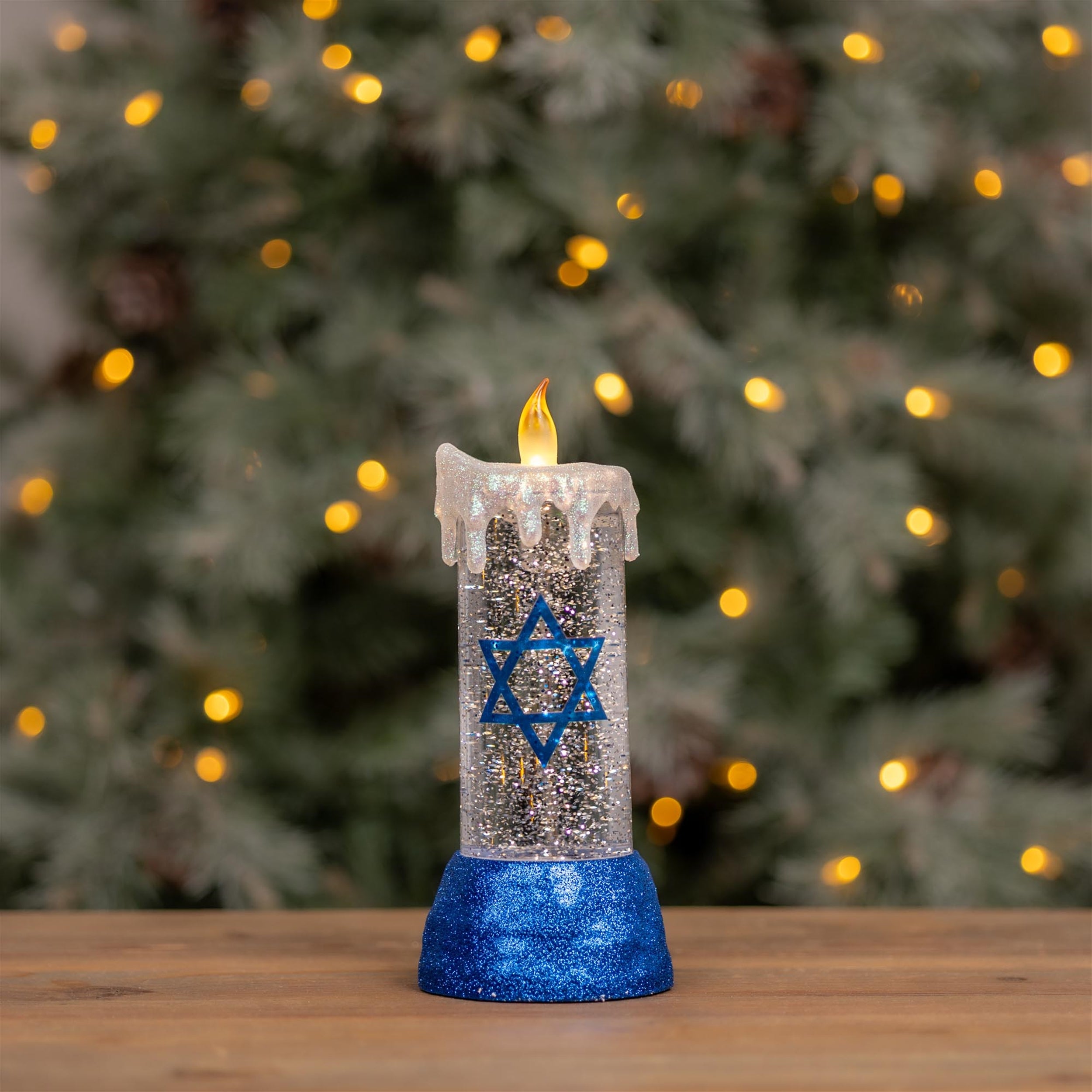 Celebrate the season with a sparkling twist on tradition. This Hanukkah candle snow globe features a classic pillar candle silhouette in elegant white and navy blue tones, adorned with a prominent Star of David. Inside, swirling glitter mimics gently falling snow, continuously powered by a built-in motor for a magical effect. An LED light adds a warm glow to your display, and the 6-hour timer offers set-it-and-forget-it convenience. Whether powered by 3 AA batteries (not included) or the included USB cord, this piece brings festive charm to mantels, shelves, or tabletops all season long.