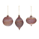 Add a touch of glamorous holiday cheer with the Iridescent Swirl Glass Ornament set. Featuring soft mauve pink and purple tones with a chic iridescent finish, these ornaments come in both traditional ball and onion shapes, beautifully adorned with a swirled glass texture. The delicate gold ornament cap and string hanger make them easy to display on your Christmas tree, while the soft colors and elegant design also make them perfect for weaving into a front door wreath or mantle garland to create a stunning seasonal statement. Sold in a set of six pieces with three assorted designs, these ornaments bring festive sophistication to any display.