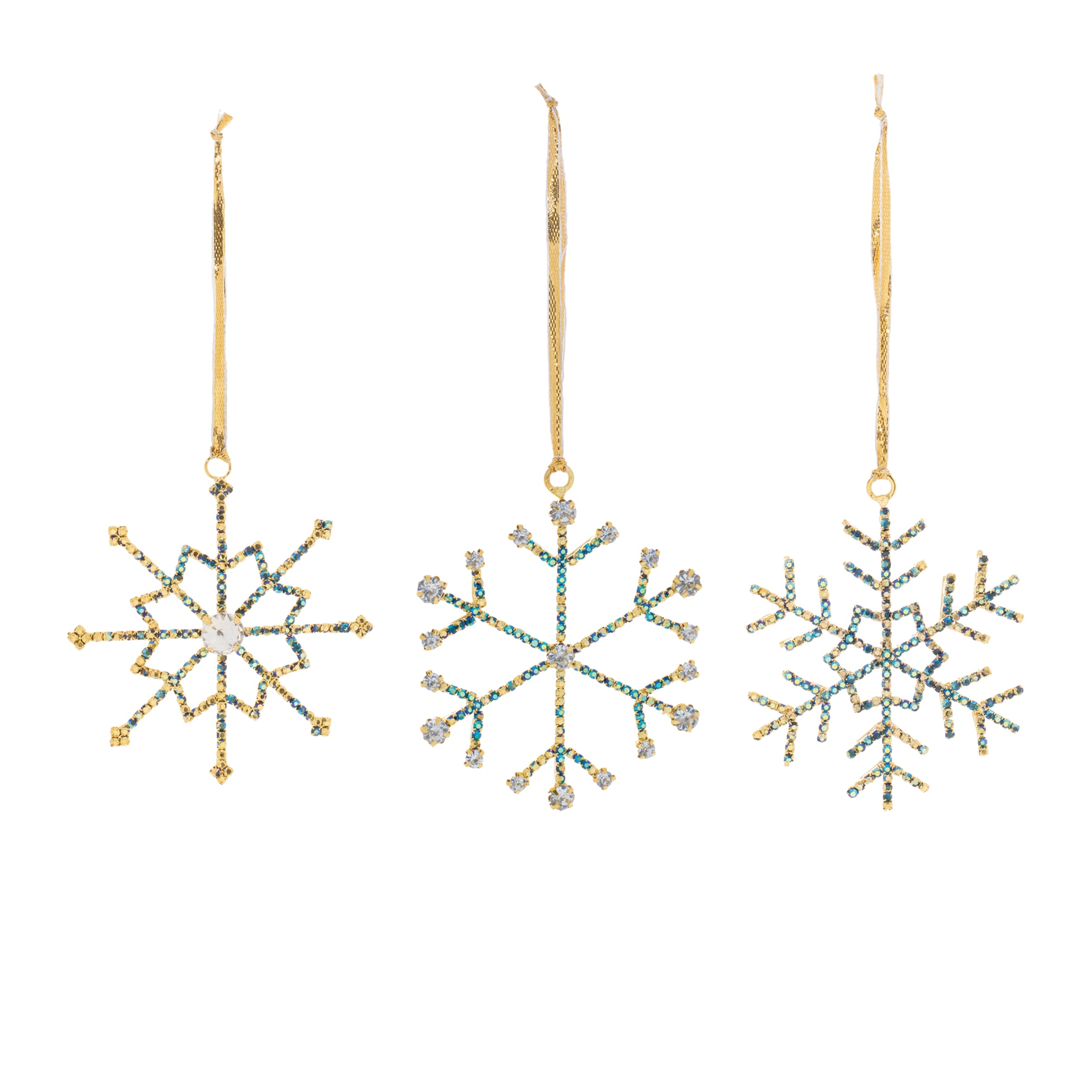 Bring a touch of sophistication to your holiday decor with the Jeweled Metal Snowflake Ornament. Featuring wintry blue and gold tones, these delicate snowflake-shaped ornaments are adorned with chic glass jewel accents, adding a luxurious sparkle to your tree. Perfect for those who love elegant holiday decor, these ornaments come with a delicate metallic string hanger for easy display. Sold in a set of 12 pieces with three assorted designs, these ornaments will fill your home with festive beauty and charm.