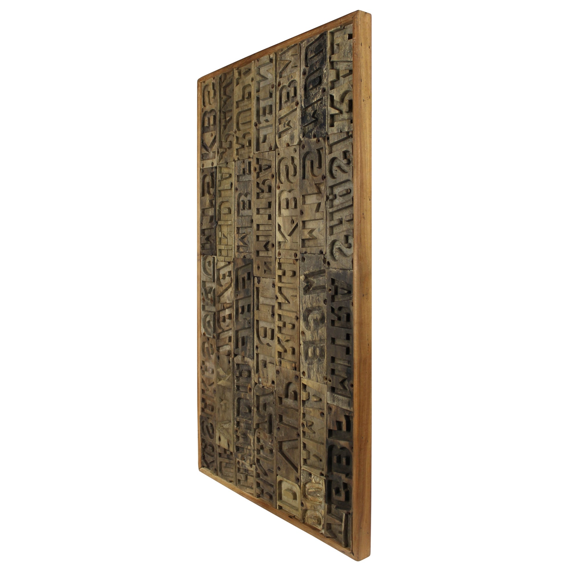 Carved wood letters are inverted as they once made a marking onto the clay inside of a brick mold have been salvaged and compiled into random patterns to create a unique piece of wall art. Hangs horizontally or vertically. Each piece will be unique.