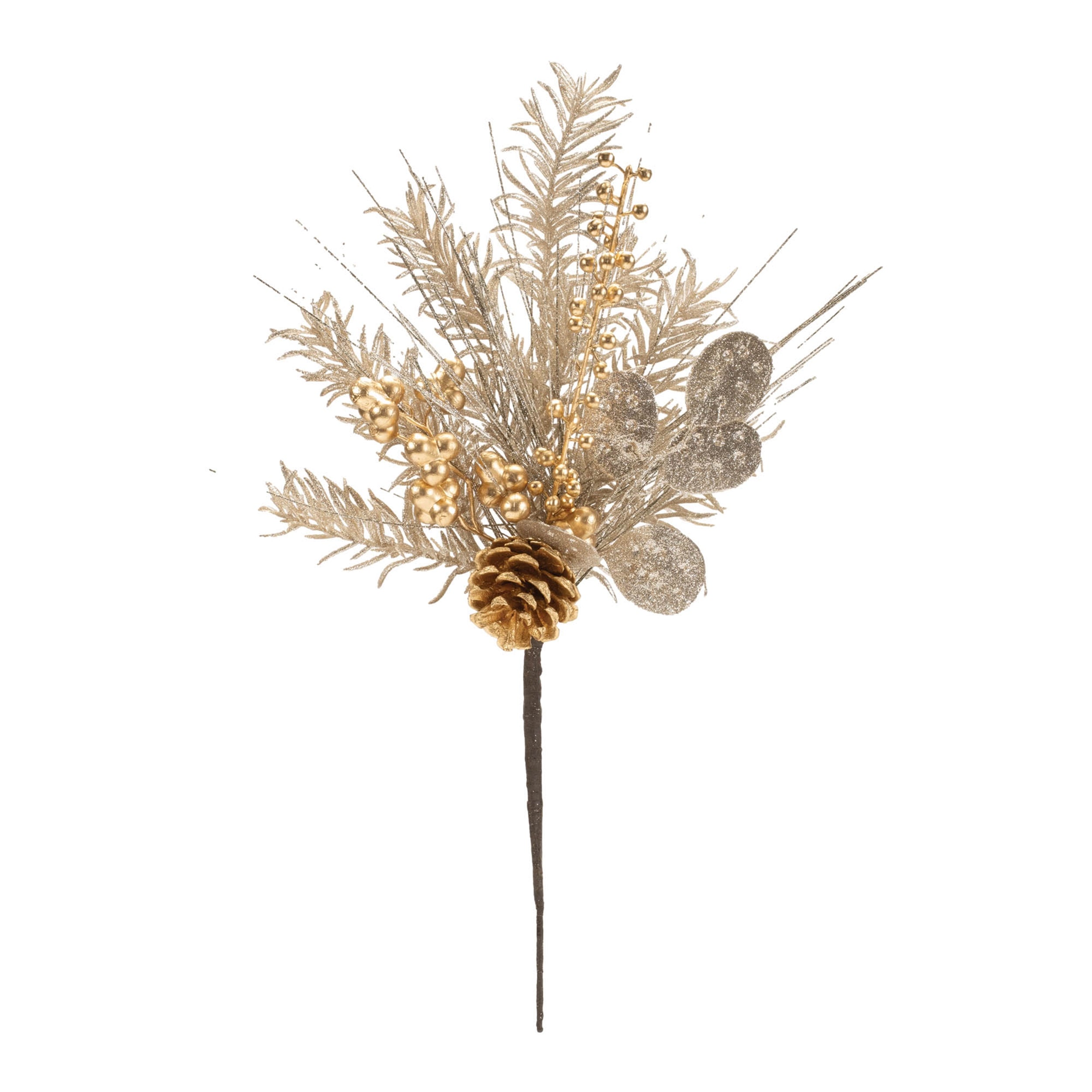 Add a touch of sophisticated shimmer to your holiday decor with this set of Mixed Pine and Eucalyptus Sprays. Featuring a festive blend of pine and silver dollar eucalyptus with metallic gold and champagne tones, these sprays bring a refined elegance to any seasonal arrangement. Accented with natural pinecones and berries, they offer a perfect balance of rustic charm and festive sparkle. The wired stems and branches provide flexibility for easy styling—ideal for wreaths, garlands, centerpieces, or holiday porch pots. Sold in a set of six, these versatile sprays are ideal for adding a pop of natural color and a sophisticated, nature-inspired touch to your festive décor.