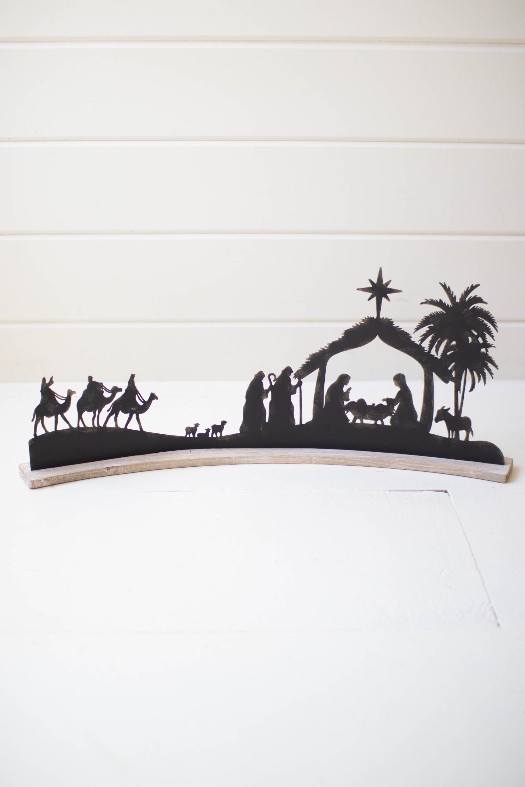 O Holy Night! This nativity is perfect for your mantle, centerpiece, or tabletop decoration. The curved white base and black metal construction make it a great gift or perfect neutral accent to any holiday decor.