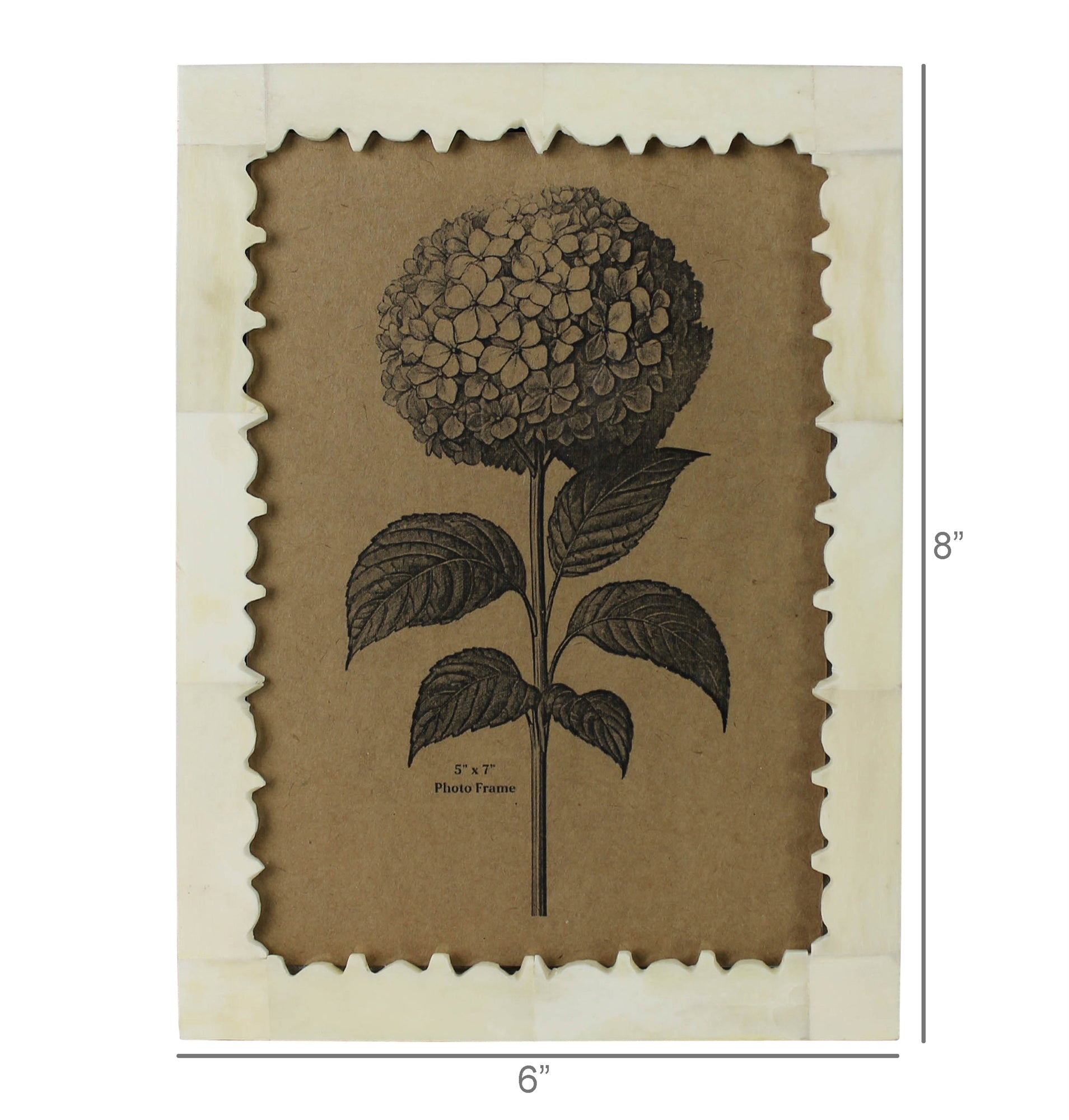 Elegant and timeless, the petite tabletop picture frame crafted from white bone features a beautifully carved edge detail. Its intricate design and soft, neutral tones add a refined touch, perfectly showcasing your cherished memories.