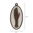 The Hand with Heart Plaque has been hand painted for a vintage inspired look. Looping a decorative ribbon through the top allows for this one of a kind plaque to hang. Wipe with dry cloth