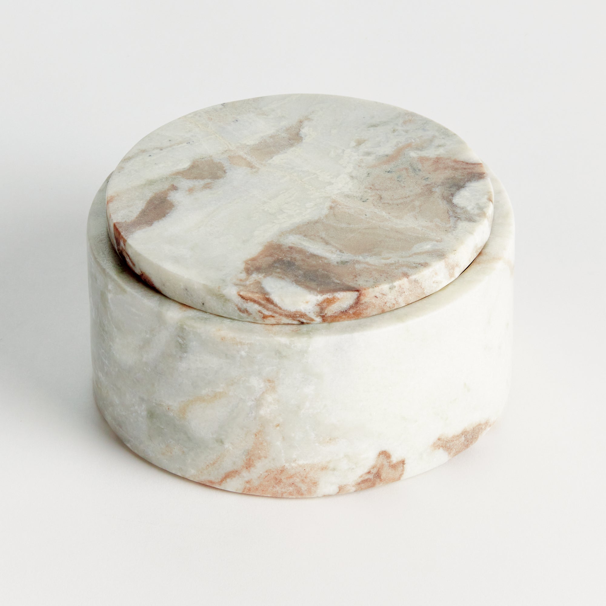 Honed to a semi-matte finish, this stunning marble is specifically known for its unique dark brown to light brown broad lines. The clay minerals found in this particular marble are what gives our round lidded box this one-of-a-kind brown veining. A beautiful accent atop home office desk, bookshelf or entry console.