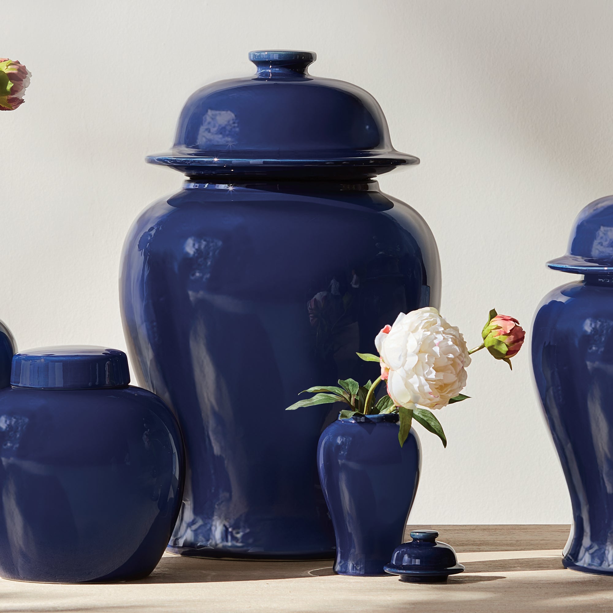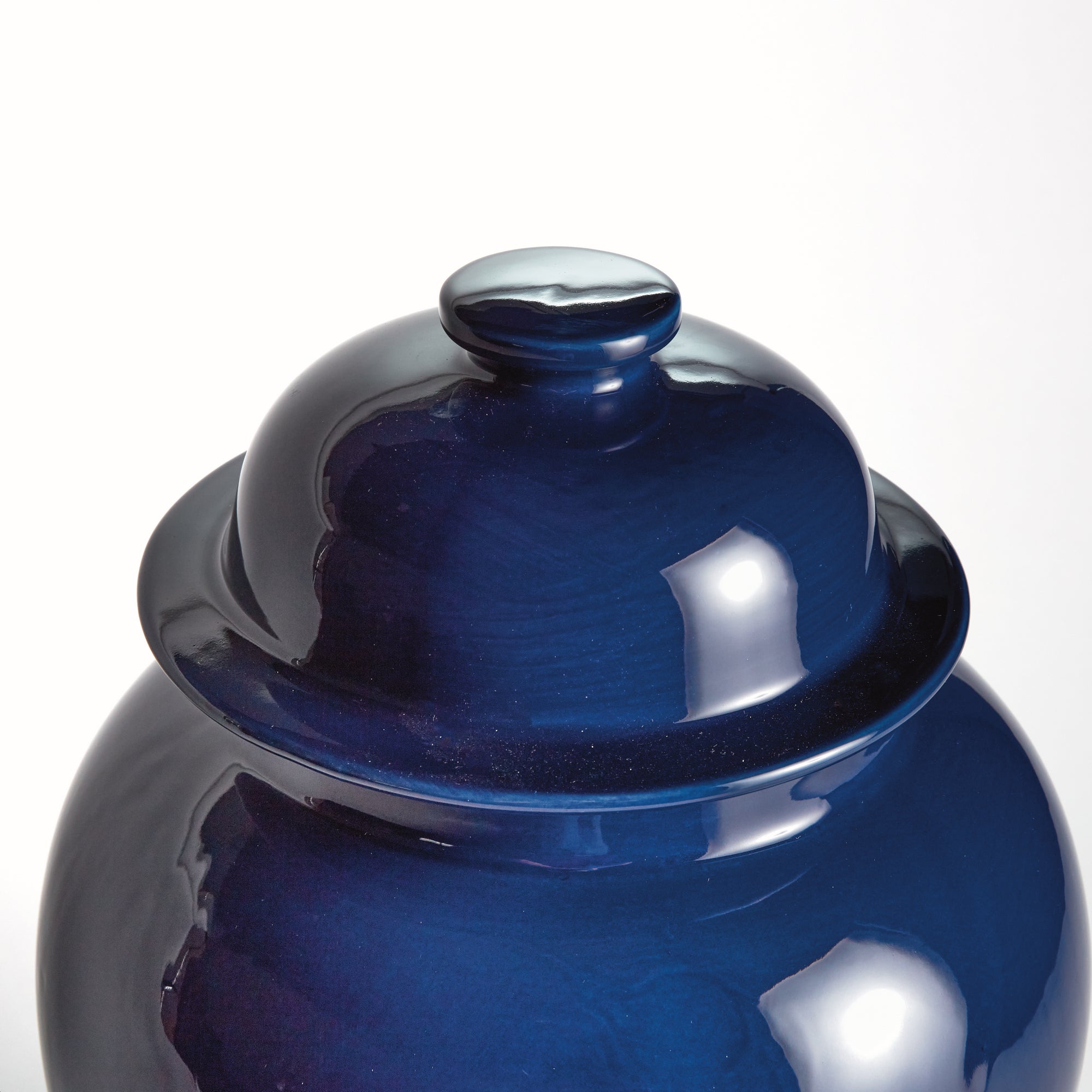 With a deep navy high gloss glaze, this lidded ginger jar is steeped in tradition. A perfect complement to the blue and white trend, and a solid choice to mix in among your patterned pieces in a bookshelf or on a credenza for a dynamic look.