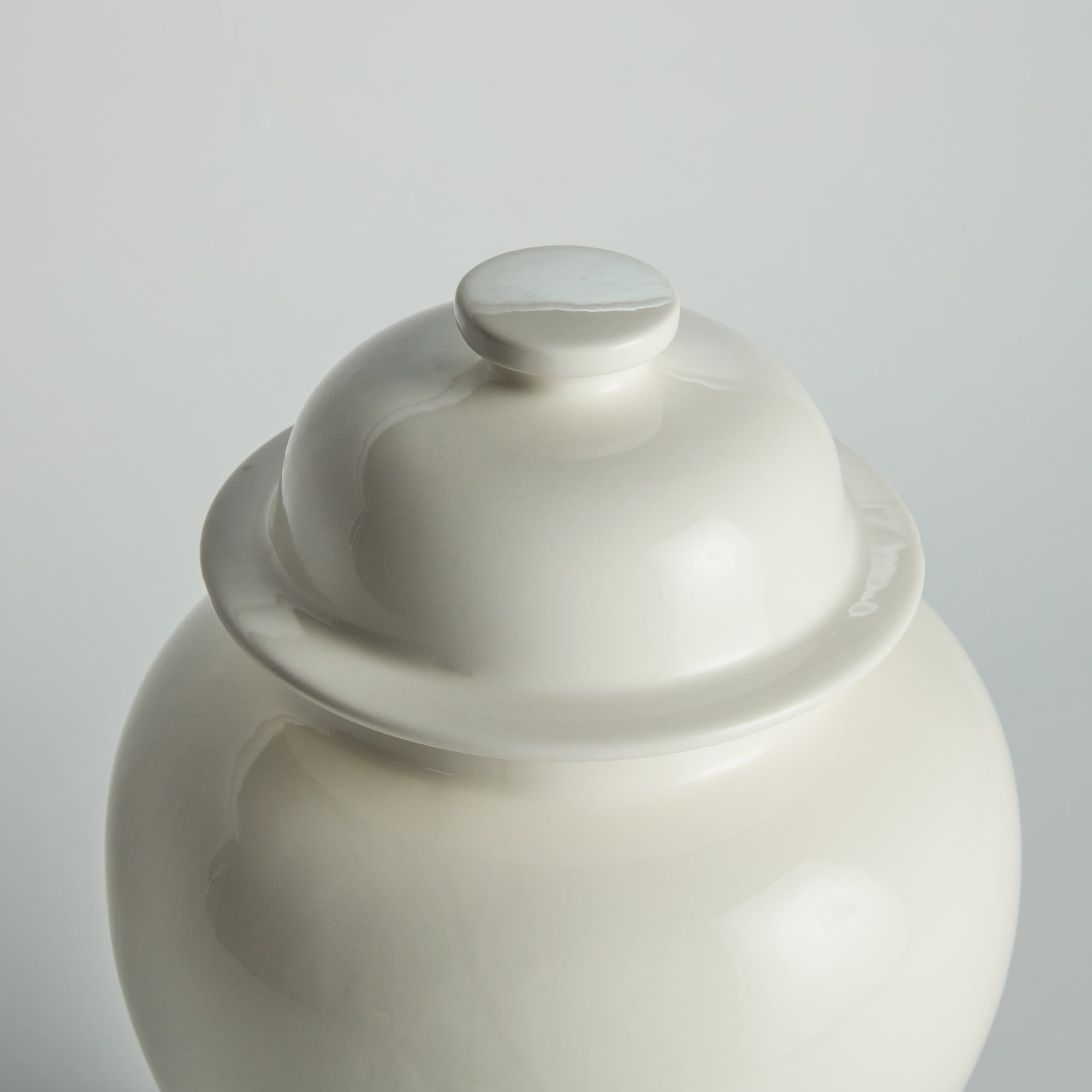 With a pure white high gloss glaze, this lidded ginger jar is steeped in tradition. A perfect complement to the blue and white trend, and a solid choice to mix in among your patterned pieces in a bookshelf or on a credenza for a dynamic look.