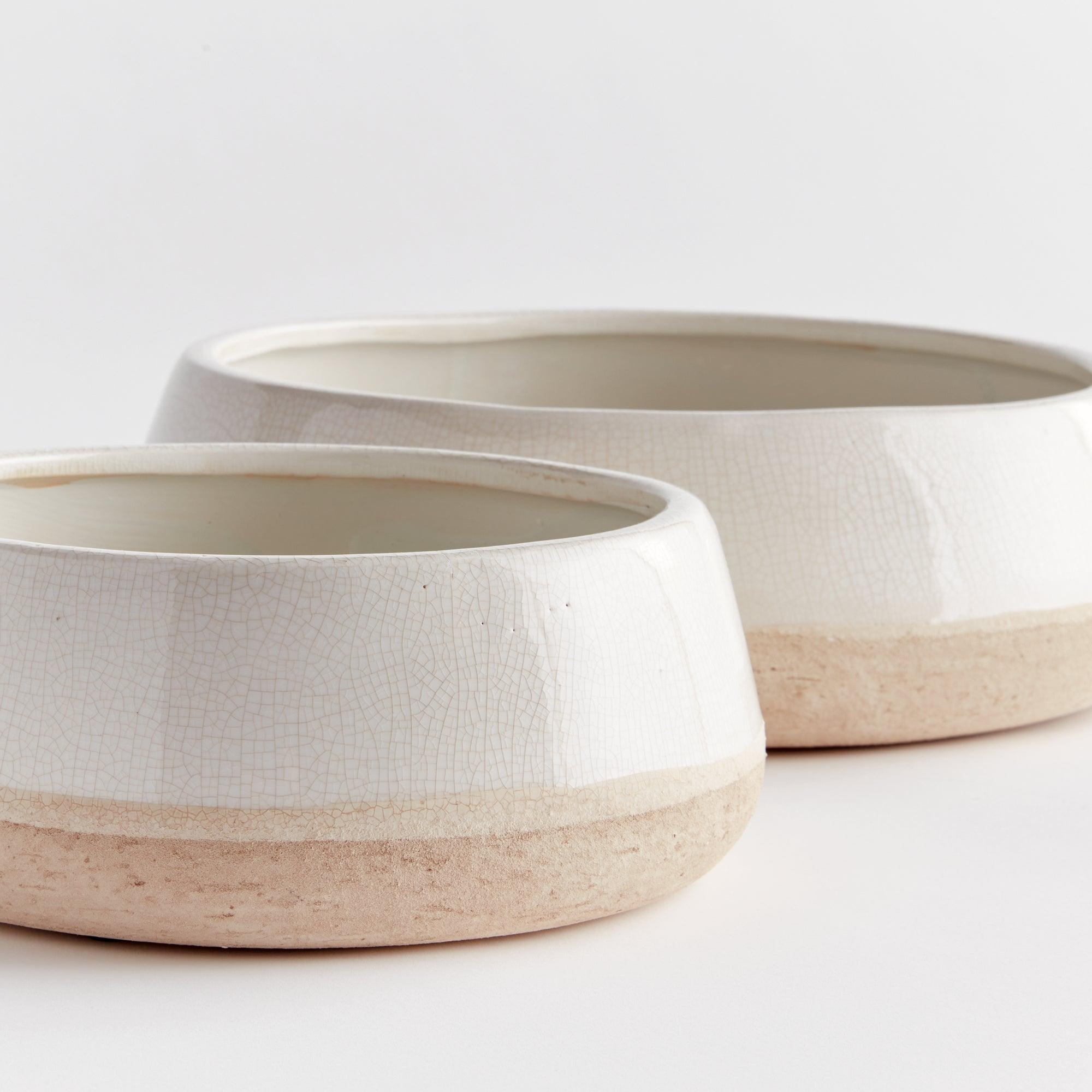 In the perfect shade of warm white and finished in a crackle glaze, this set of bowls adds a subtle sophistication to any space. The raw clay base is the natural touch that grounds the piece. Add some natural orb accents or display as is for a clean look.
