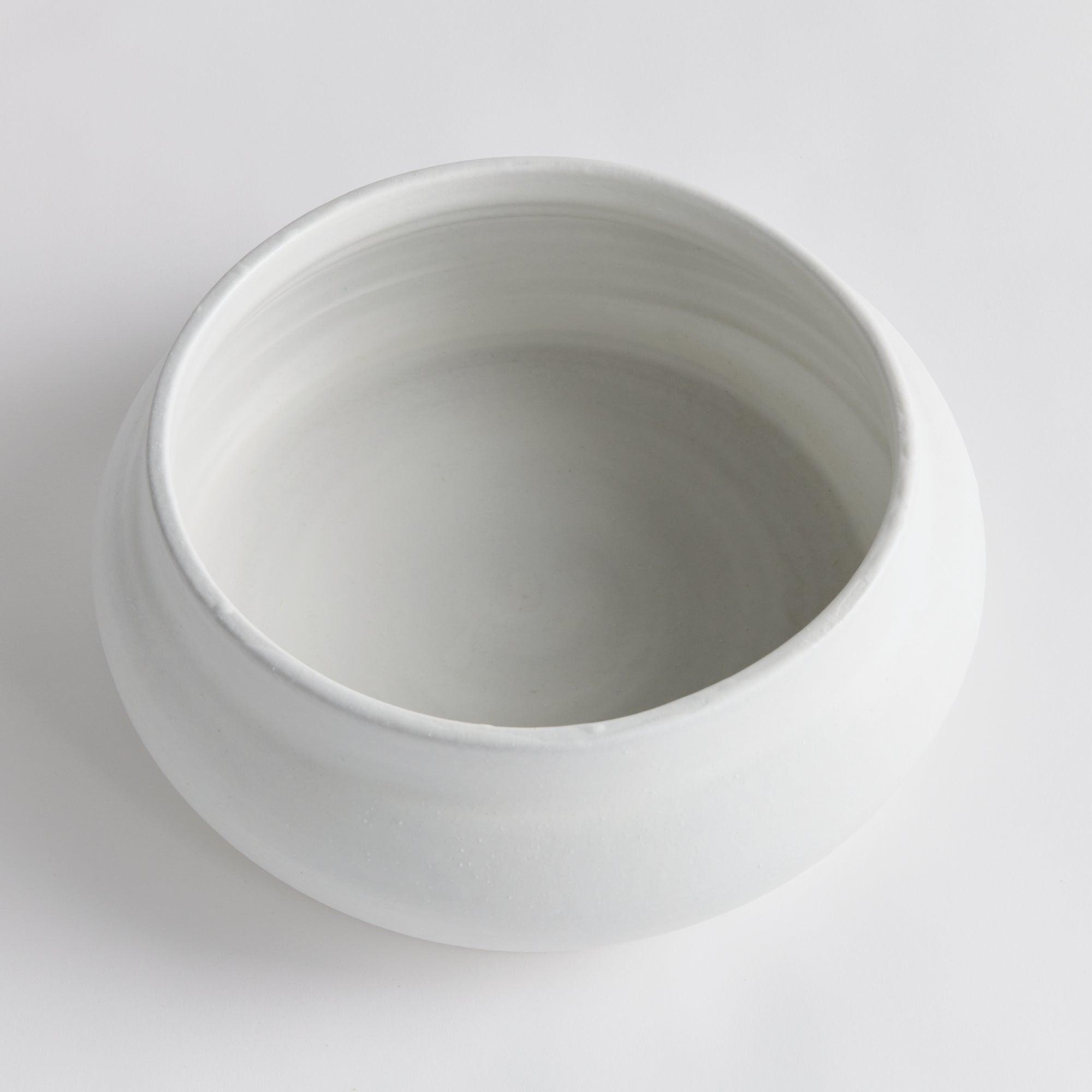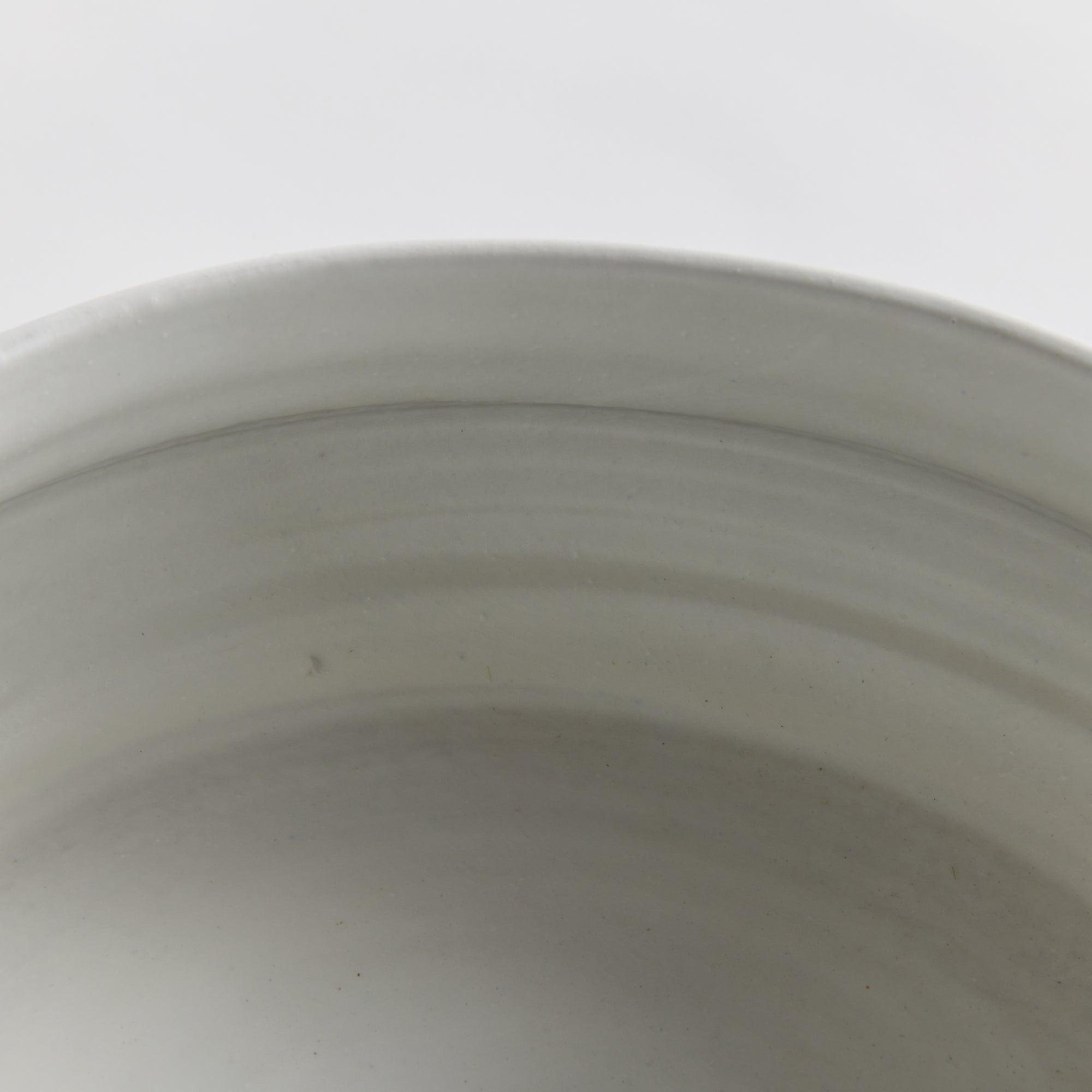 Hand thrown and perfectly imperfect, this terracotta bowl brings the character. With subtle horizontal ribbing that shows through the white uneven matte glaze, It makes a lovely accent tucked in a bookshelf, or featured on a mantle or console.