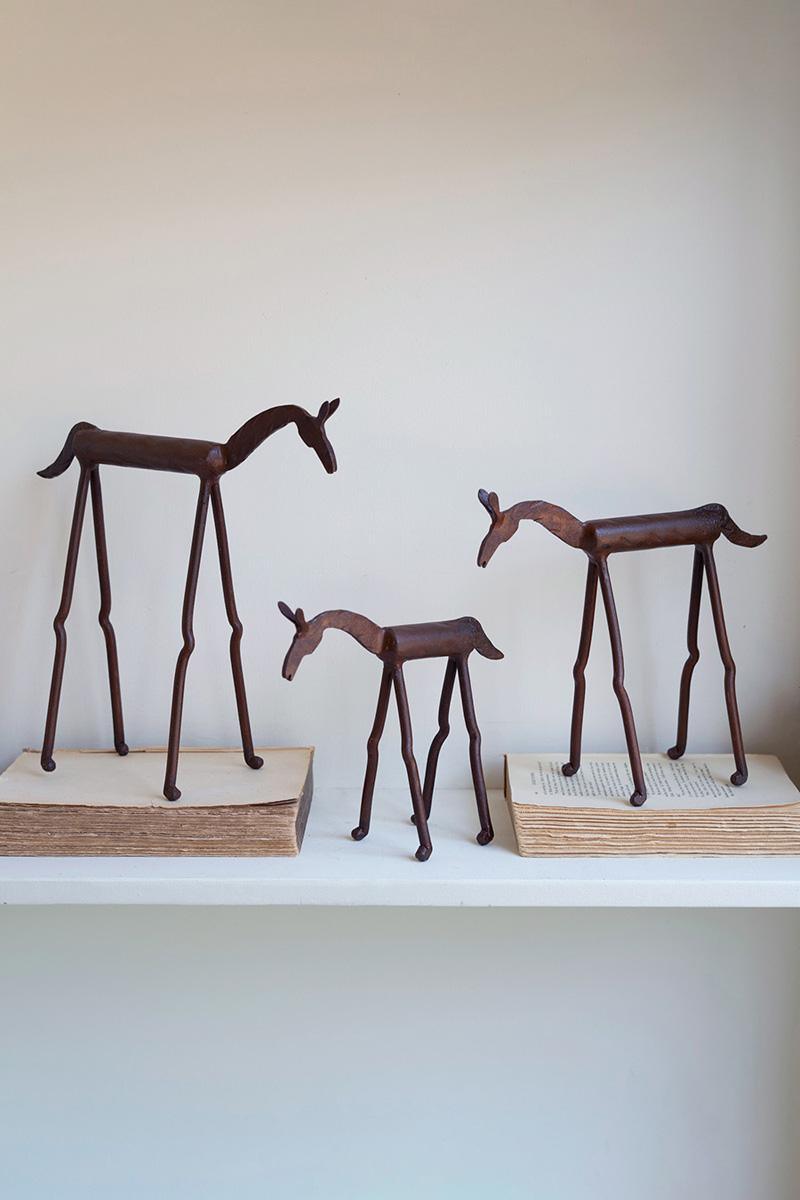Grab this set of three horses made in India of forged iron. Three different sizes mean you can group or split them for different looks. These knobby-kneed fellows deserve a prime place on your shelves at home or in the stables.