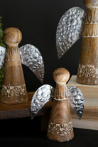 These wood and tin tabletop angels with carved bodies and hammered wings are a unique addition to your holiday decor. Set them on your mantle or around your nativity to represent the heavenly host. This set of three is made in India.Â