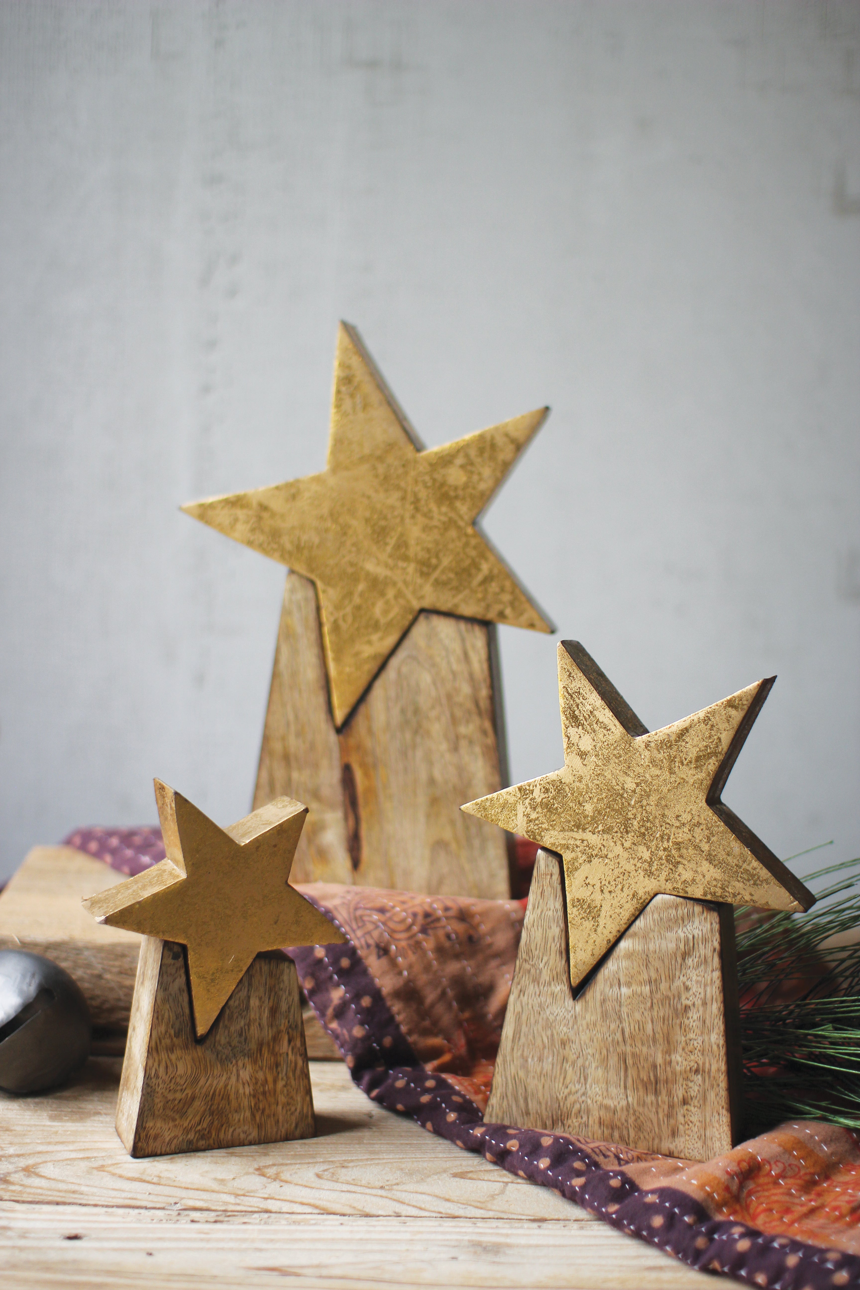 Ring in the holiday season with this set of 3 wooden Christmas stars. Made in India, this set has a gold finish and is stationed on a wood base. They will look wonderful on your coffee table or bookshelf. Made in India Do not expose to