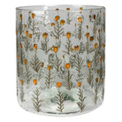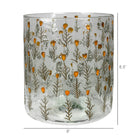 Earthen materials appropriated from nature are forever conserved in this enameled hurricane. Orange petals and juniper stems form a pattern are enameled onto simple glass silhouettes presenting an intriguing garden luminary.