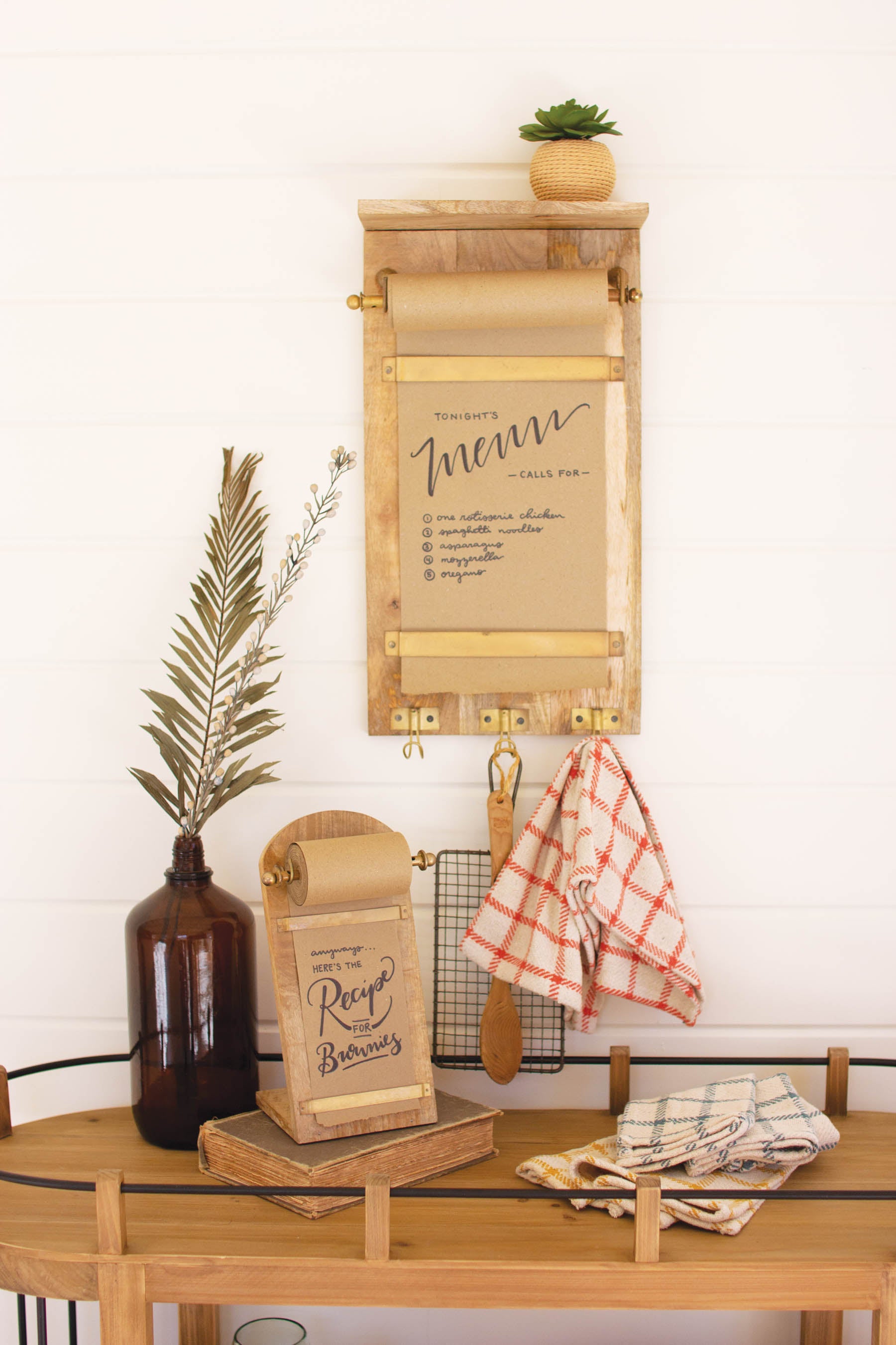 Jot down your notes or grocery list on the go with this tabletop notes roll. Make endless lists, doodles, or drawings on this wooden roll with brass accents. Made in India, the note roll suits any space and makes a great gift. Uses 4" replacement note roll.