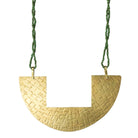 A hand-hammered and graphically shaped brass crest is paired with a twisted verdigris green beaded strand, bringing two natural and easily wearable materials together. Adjustable closure. 5" x 3" pendant on 14" beaded chain