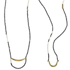 Glass beads of undulating colors, tones and patterns are paired with brass charms and strung on line to create an easy-to-wear and perfect-for-layering necklace. Assortment of 2 brass charms and bead patterns. 29” length