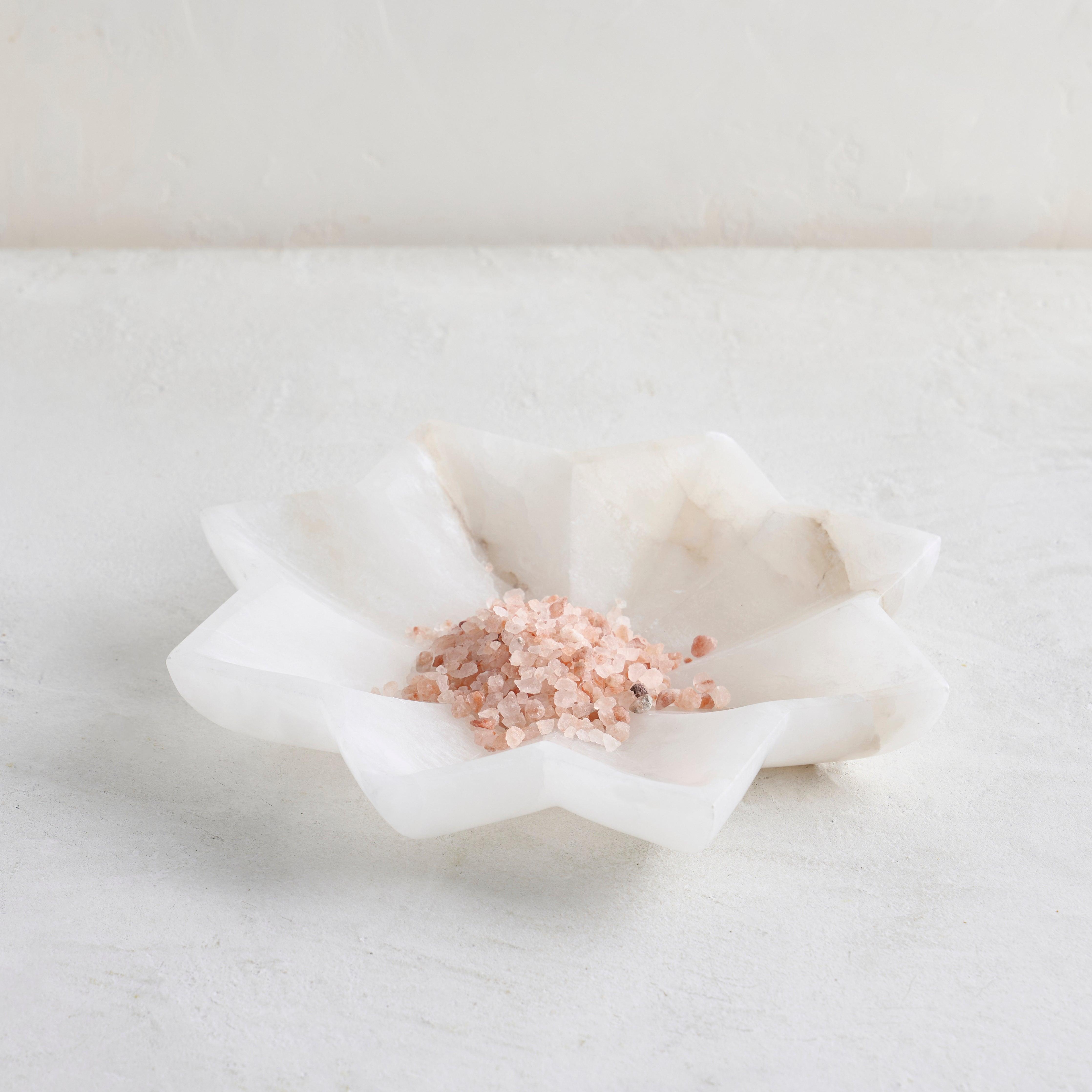 The unmatched beauty of white alabaster sets the stage for this wide, low bowl, sculpted by hand into a pleated, pointed star. This shallow, translucent dish provides a unique display for your finest treasures, or simply adds a touch of luxury to your space. Variations in color can be expected from piece to piece and are not considered flaws.