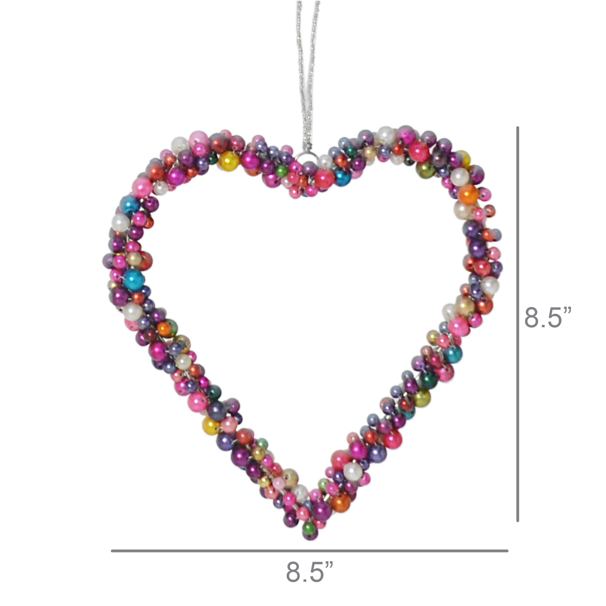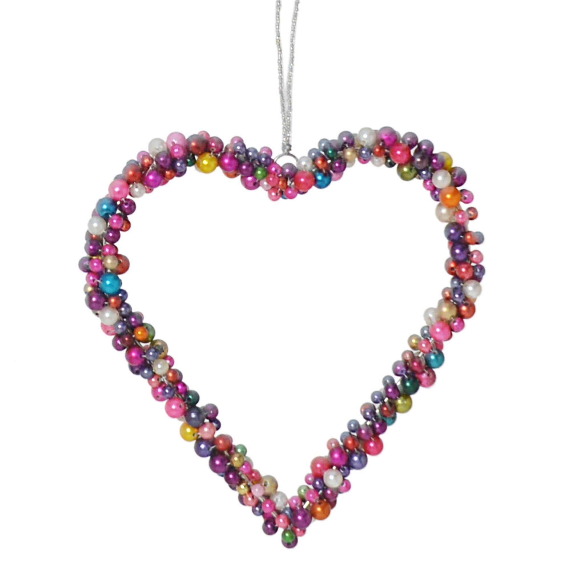 A wire heart form bedazzled with multi colored beads, hangs from a beaded wire hanger.