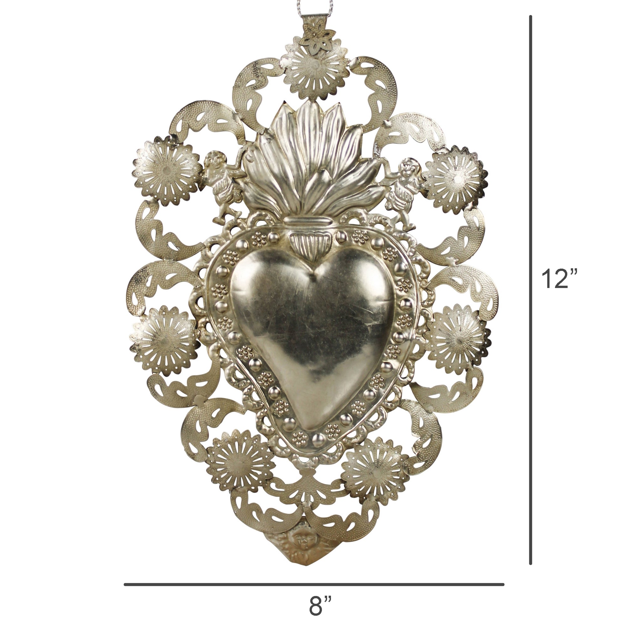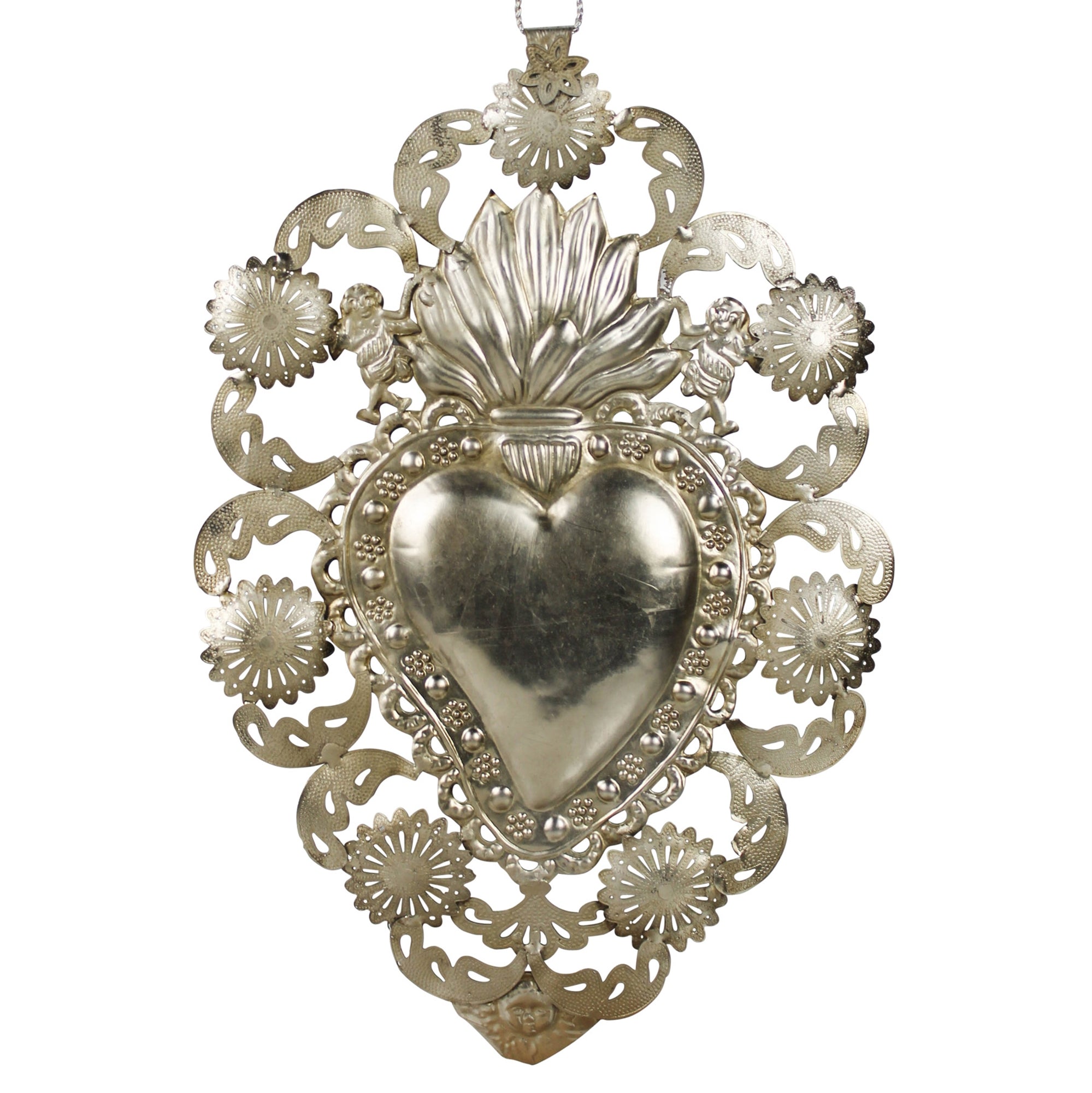 Pressed of metal with an antique silver finish, this sacred heart is a truly striking object. Strong details and deeply intrinsic meanings bring life into any space.