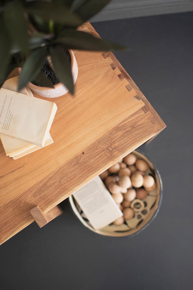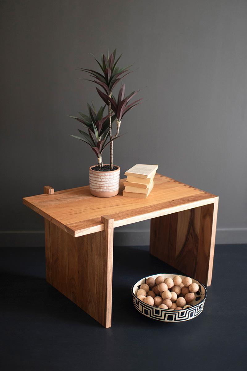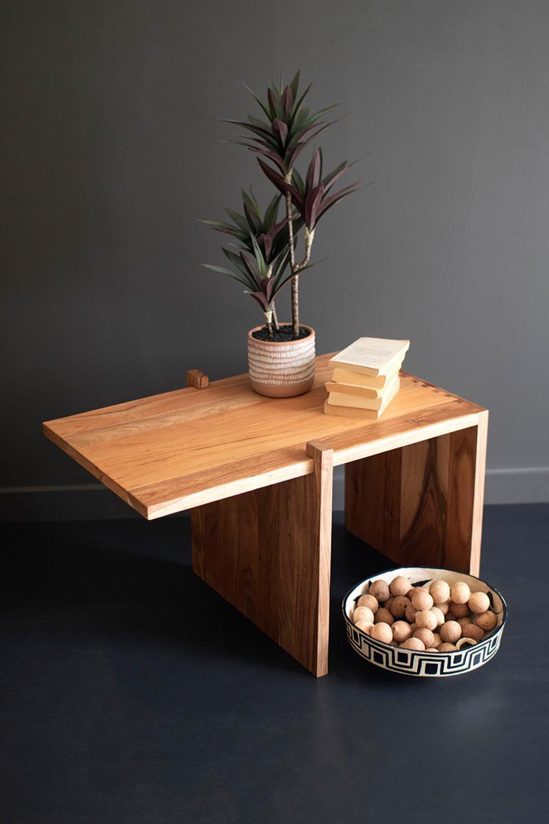 This unusual coffee table is made of acacia wood. It's adjustable for your space's needs. Angular and sturdy, this table is fits any modern space.