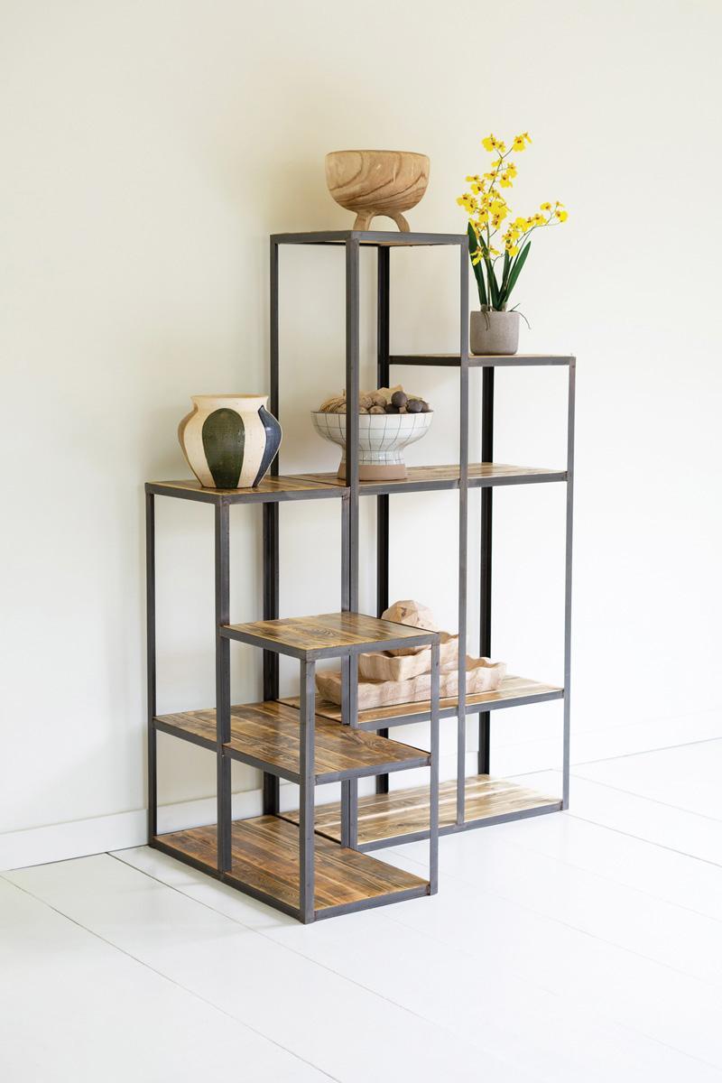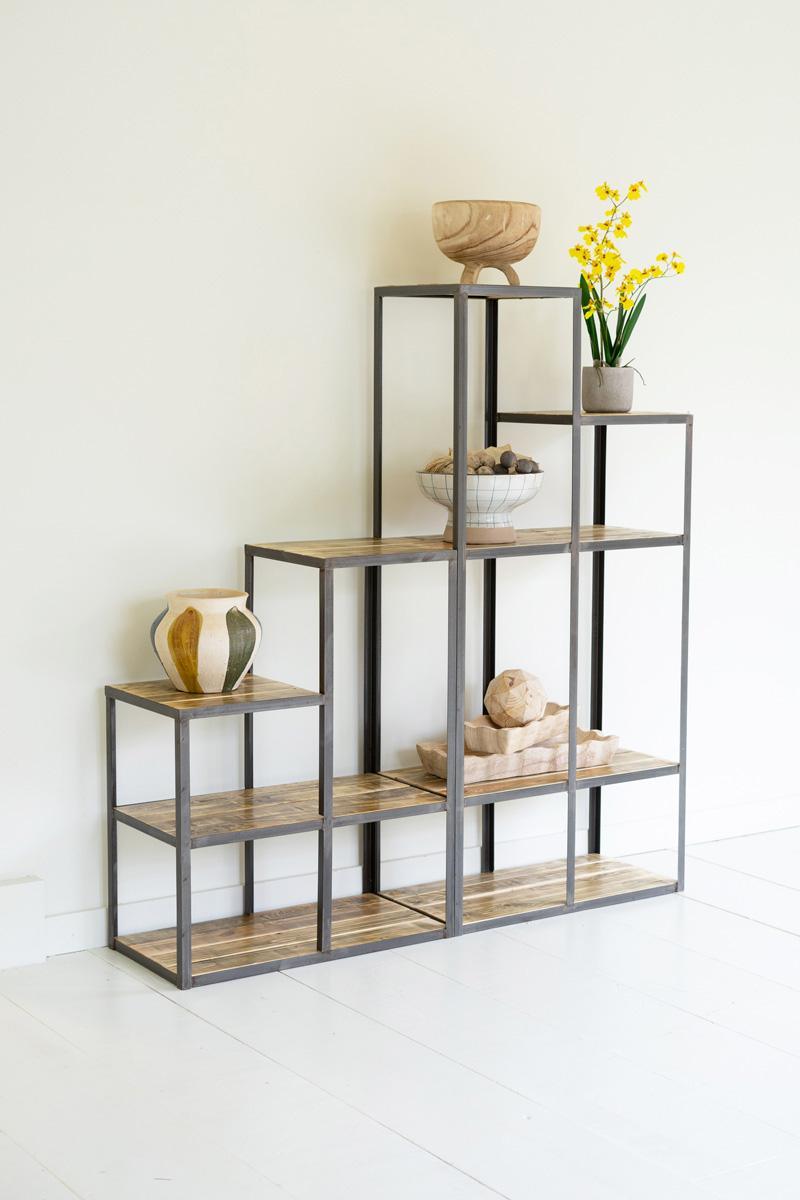 Iron and wood stair-step display shelves work side by side, back to back, or in an L configuration for store displays or industrial bookshelves. This set of two is the answer. How will you arrange them?