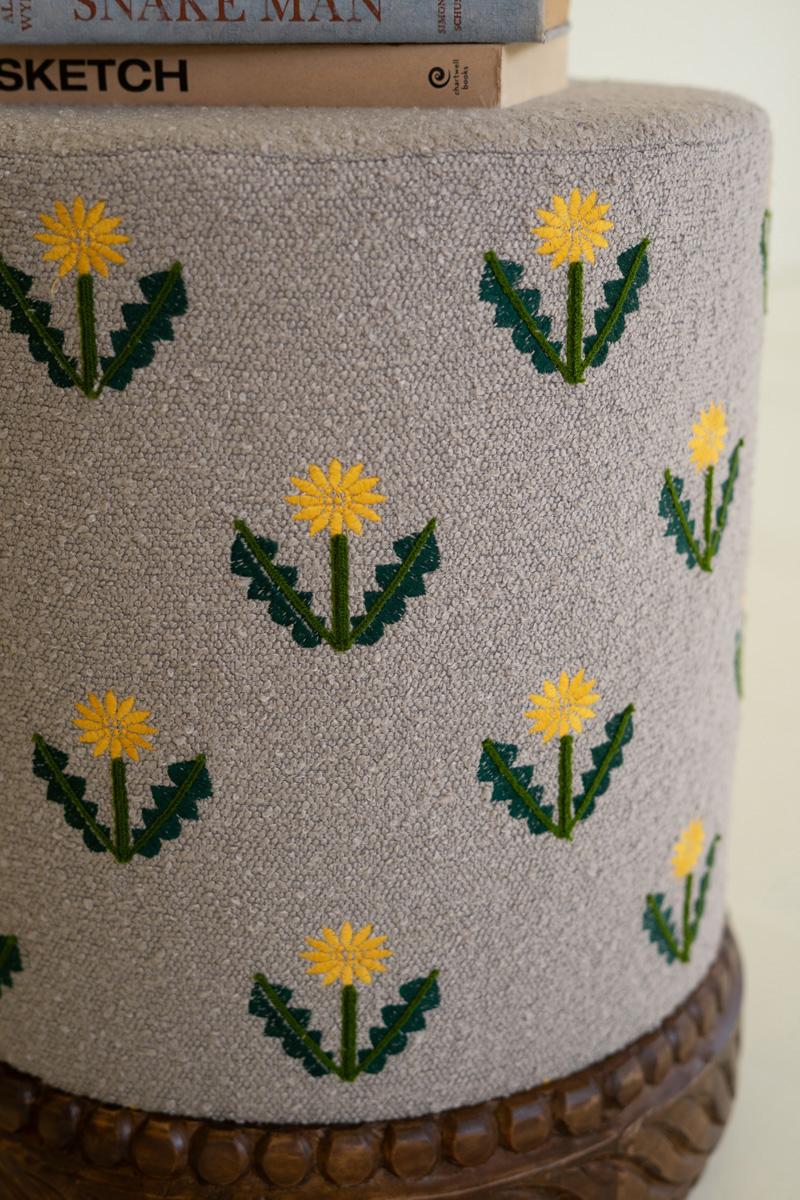 Cushion on hard wooden base. Embroidered details on boucle. Rubber dots on bottom.
