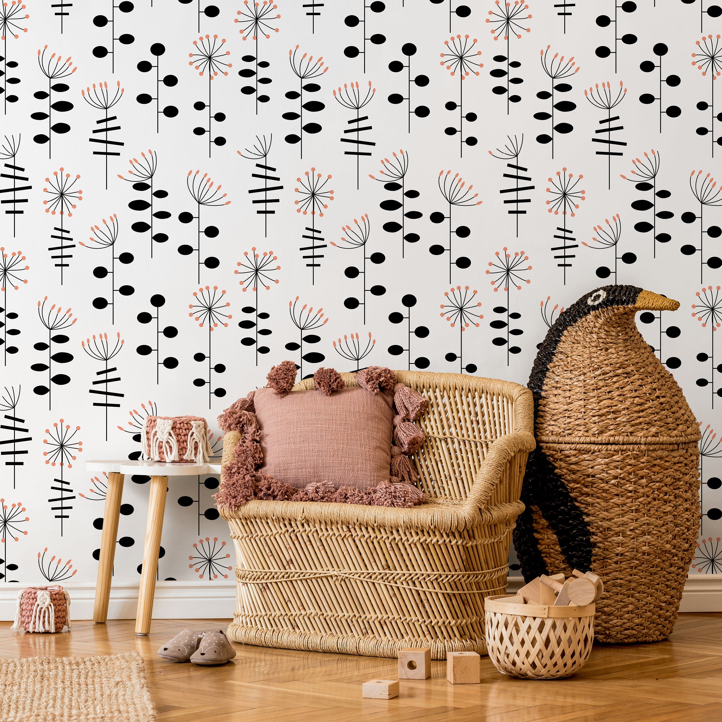 Abstract Floral Wallpaper with Stylized Botanicals in Black and Terracotta - A882