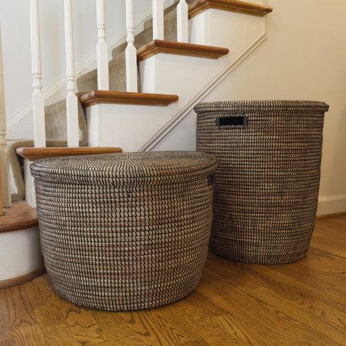 This minimalist Black Floor Basket with a flat lid adds a touch of handmade global decor to any room. A perfect storage container, it has both practical functionality and a minimalist, contemporary look that would look at home practically in any space. With its wide opening it's perfect to store throw pillows or blankets in the living room or bedroom, anything bulky - its uses are endless! It also looks great with the taller black basket as a focal point in any room.