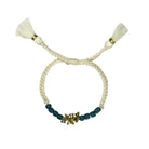 Adjustable bracelet made from braided cotton with tassel ends, accented by brass highlights and colored beads. This boho-inspired piece blends texture and color, adding a unique, earthy touch to any outfit. 3” diameter, adjustable