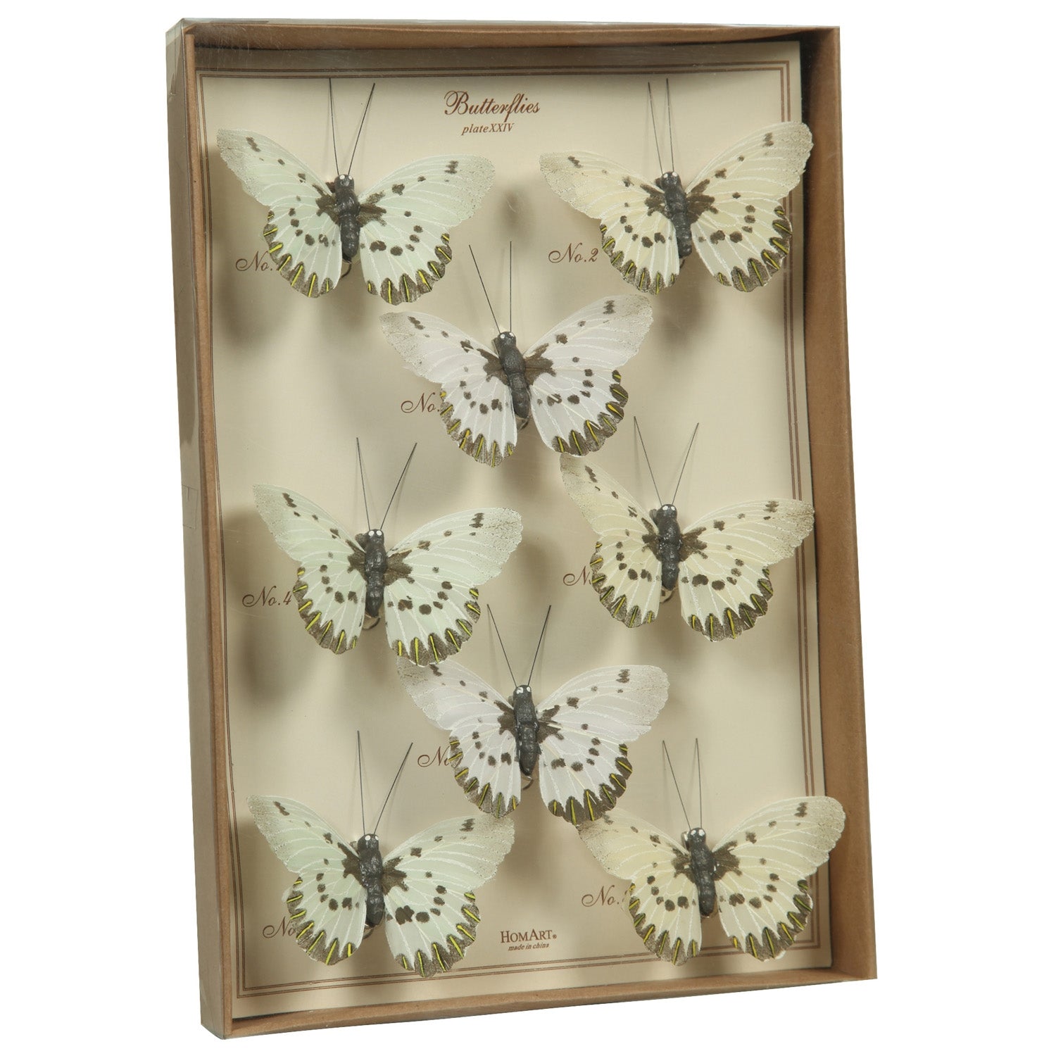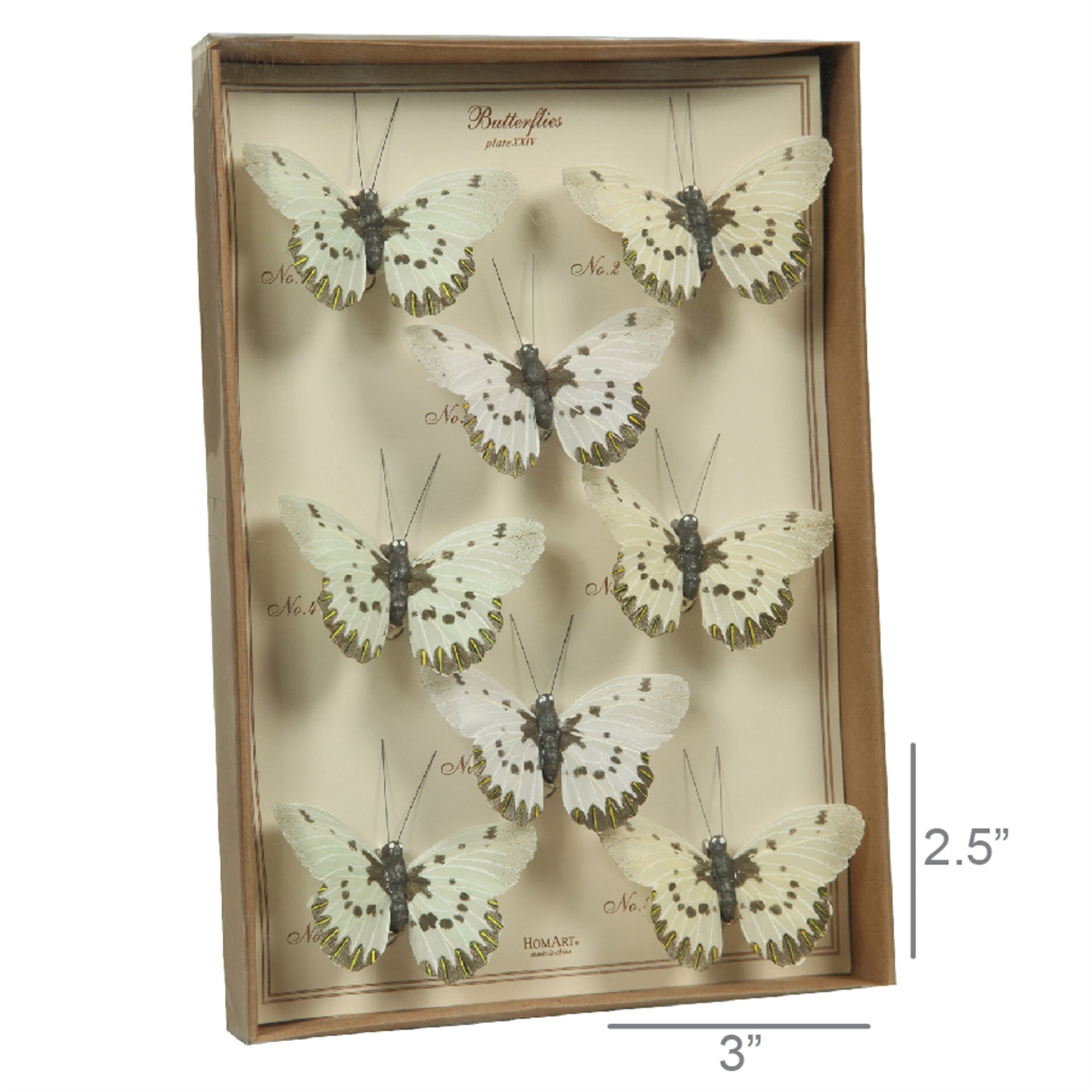 Eight, hand painted, feather butterflies packaged in an 8x11 Specimen style box. A unique addition to floral arrangements, gift wrap or home decor!