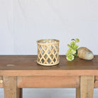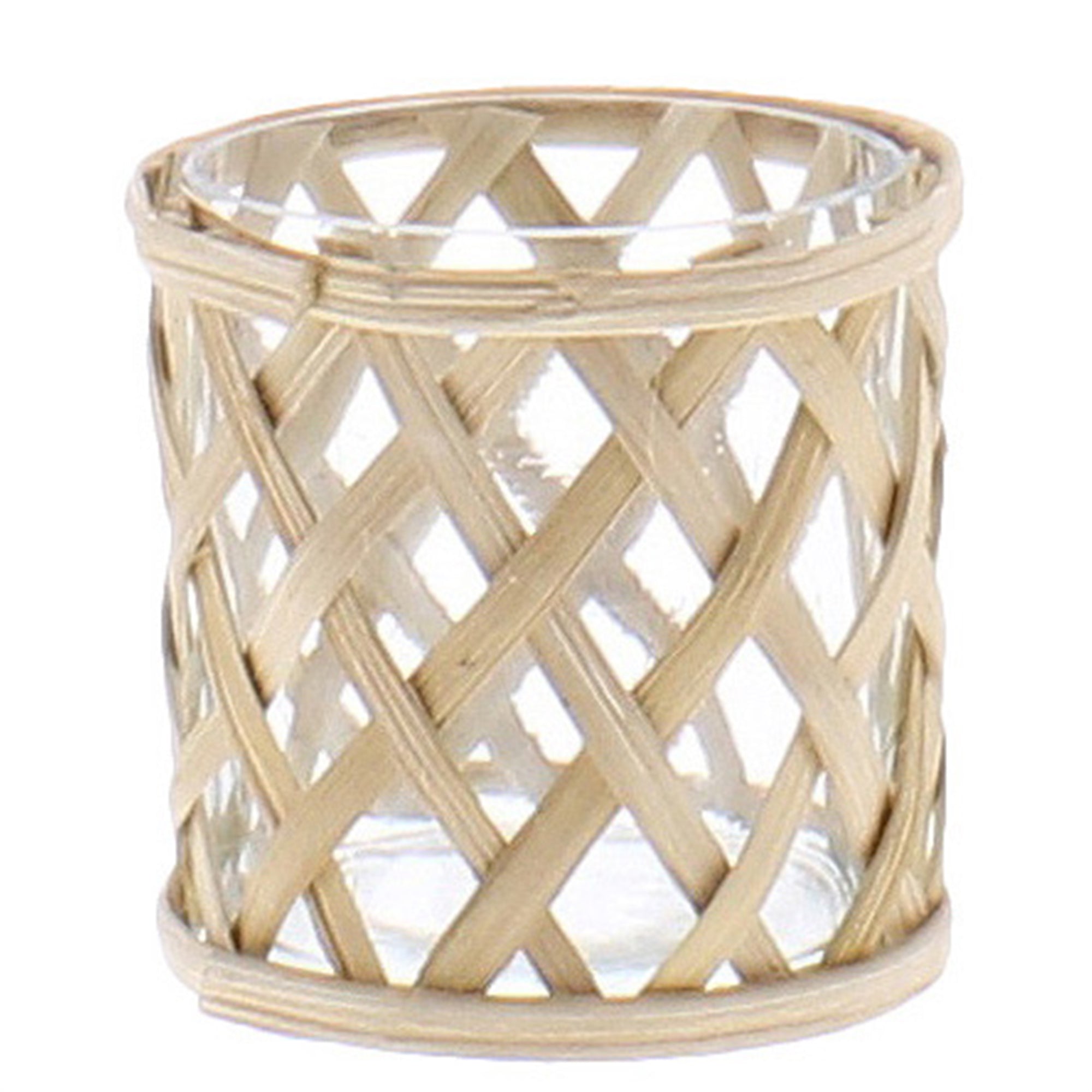 An intricate weave of thin bamboo dresses this clear glass vase made to house flower groupings and add warmth to any space.