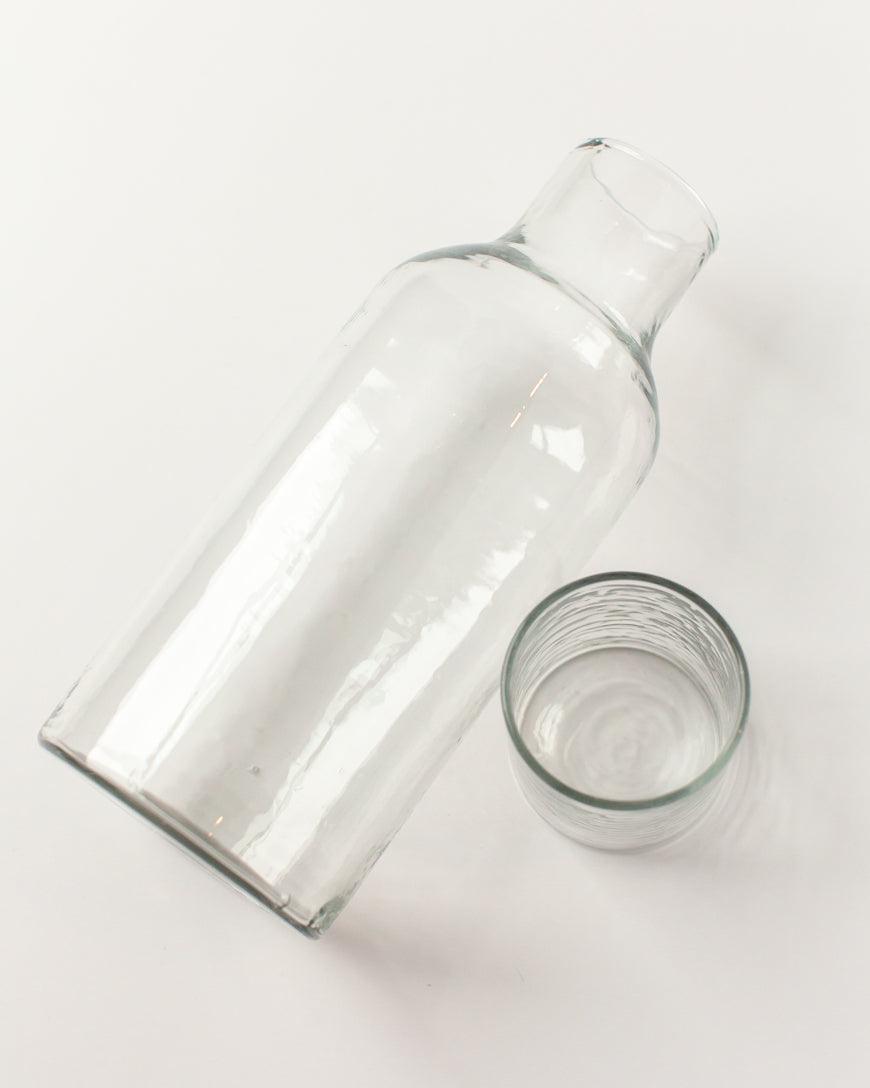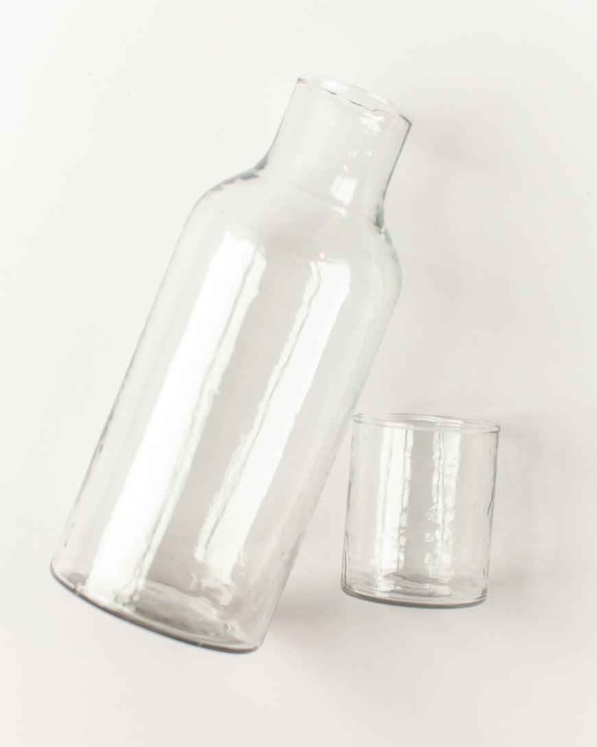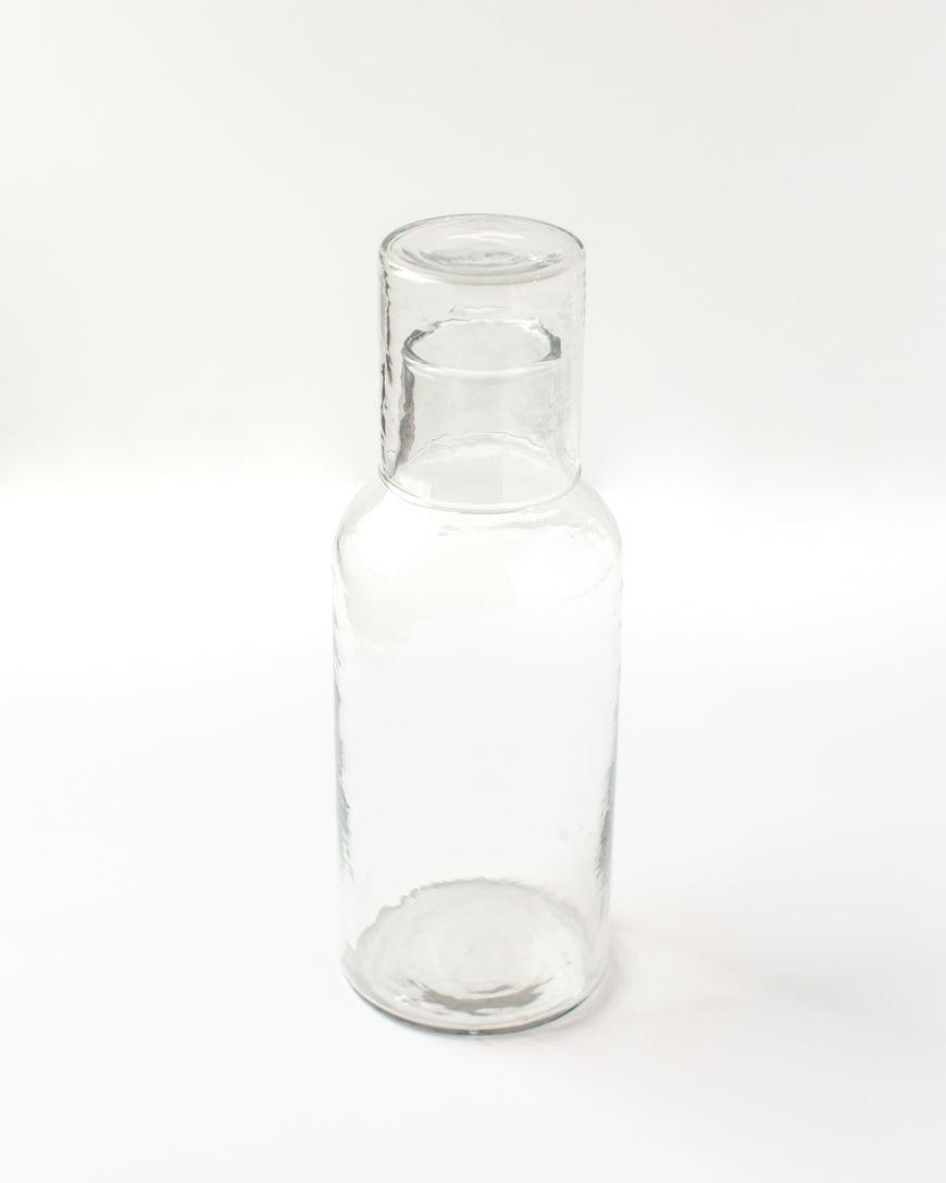 Form meets function in these stunning glass carafes. Each is handblown from recycled glass then meticulously hammered by hand for a truly unique finish. The set includes a carafe and lid that doubles as a small drinking glass.