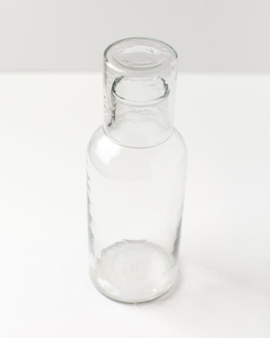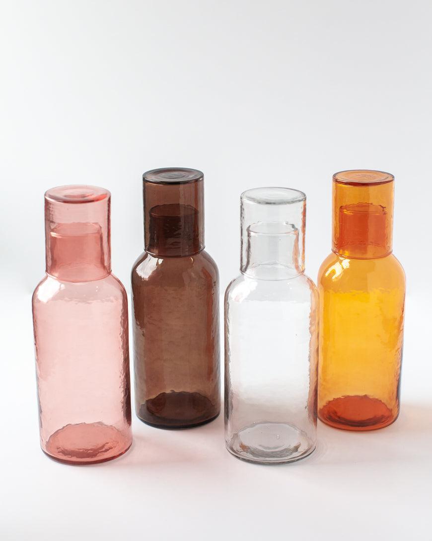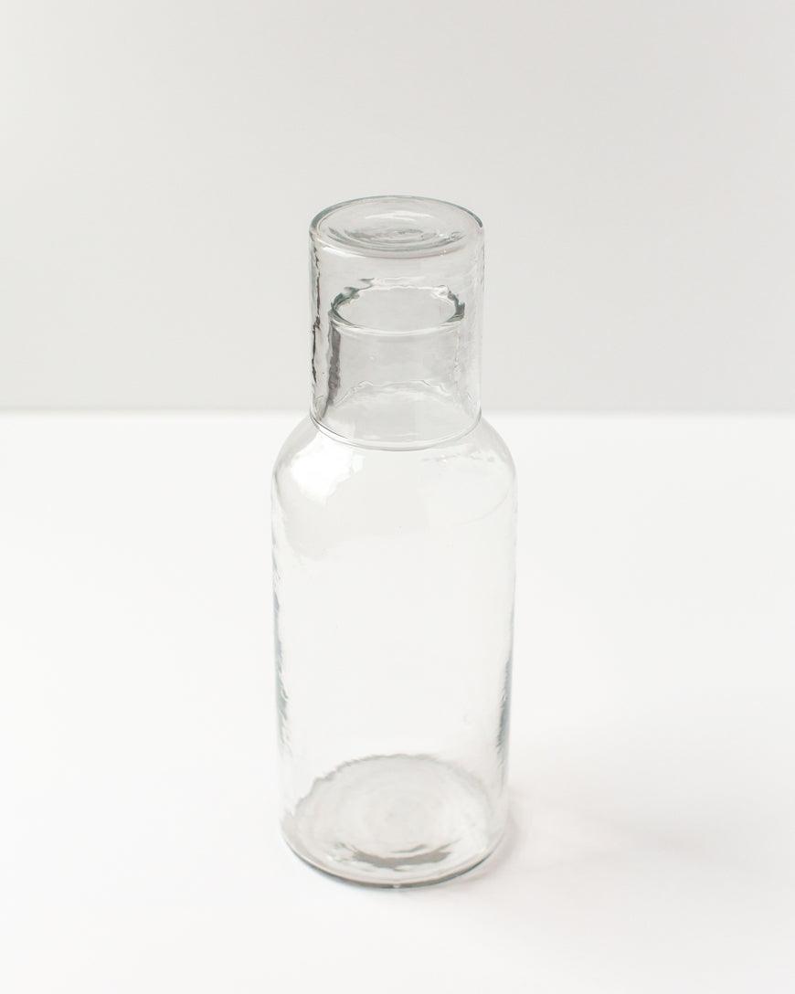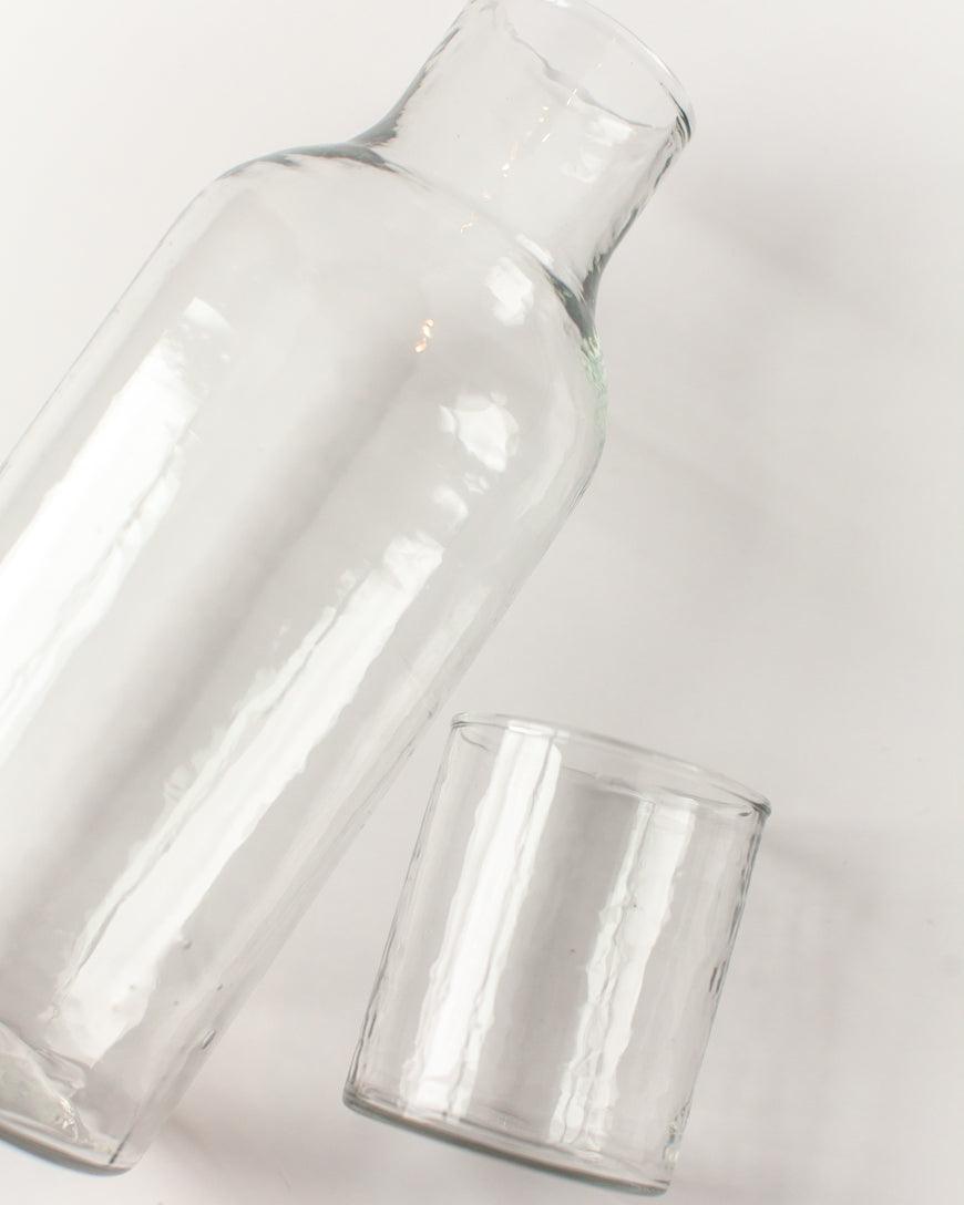 Form meets function in these stunning glass carafes. Each is handblown from recycled glass then meticulously hammered by hand for a truly unique finish. The set includes a carafe and lid that doubles as a small drinking glass.