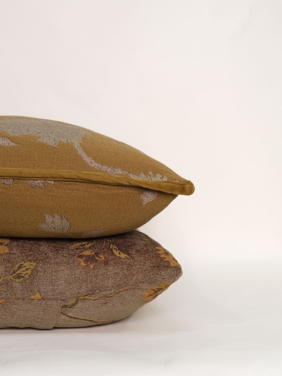 Charlotte is one of the reversible tapestry jacquard pillows in the Twenty Third by Deanne European Romance collection. You get two pillows in one: one side is a beautiful, muted brown with a rich floral tapestry design, which reverses into a golden ochre floral design with velvet gold piping. This romantic pillow echoes the allure of vintage paintings and tapestries, with exquisite details that will surely captivate all of your guests. By getting all three pillows from the European Romance collection, you get 6 different designs, all guaranteed to add a touch of elegance and romantic charm to your living space.