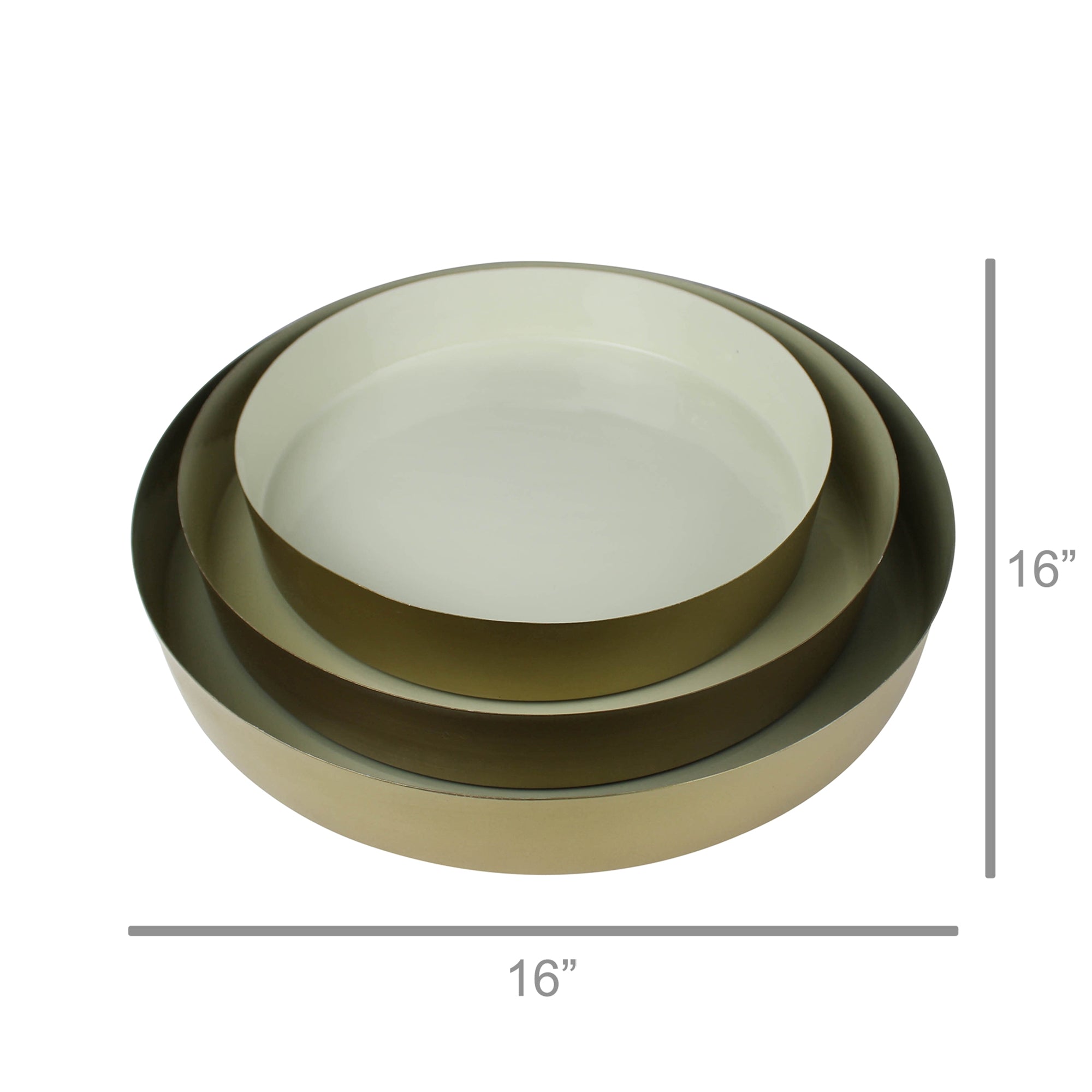 Crafted of stainless steel with a gold exterior and an interior of coated enamel for a sophisticated, casual look, this set of 3 trays in neutral hues is perfect for serving up drinks, corralling books and magazines. Wipe clean with a damp cloth. Sm: 12x12x2, Med: 14x14x2, Lrg: 16x16x2.