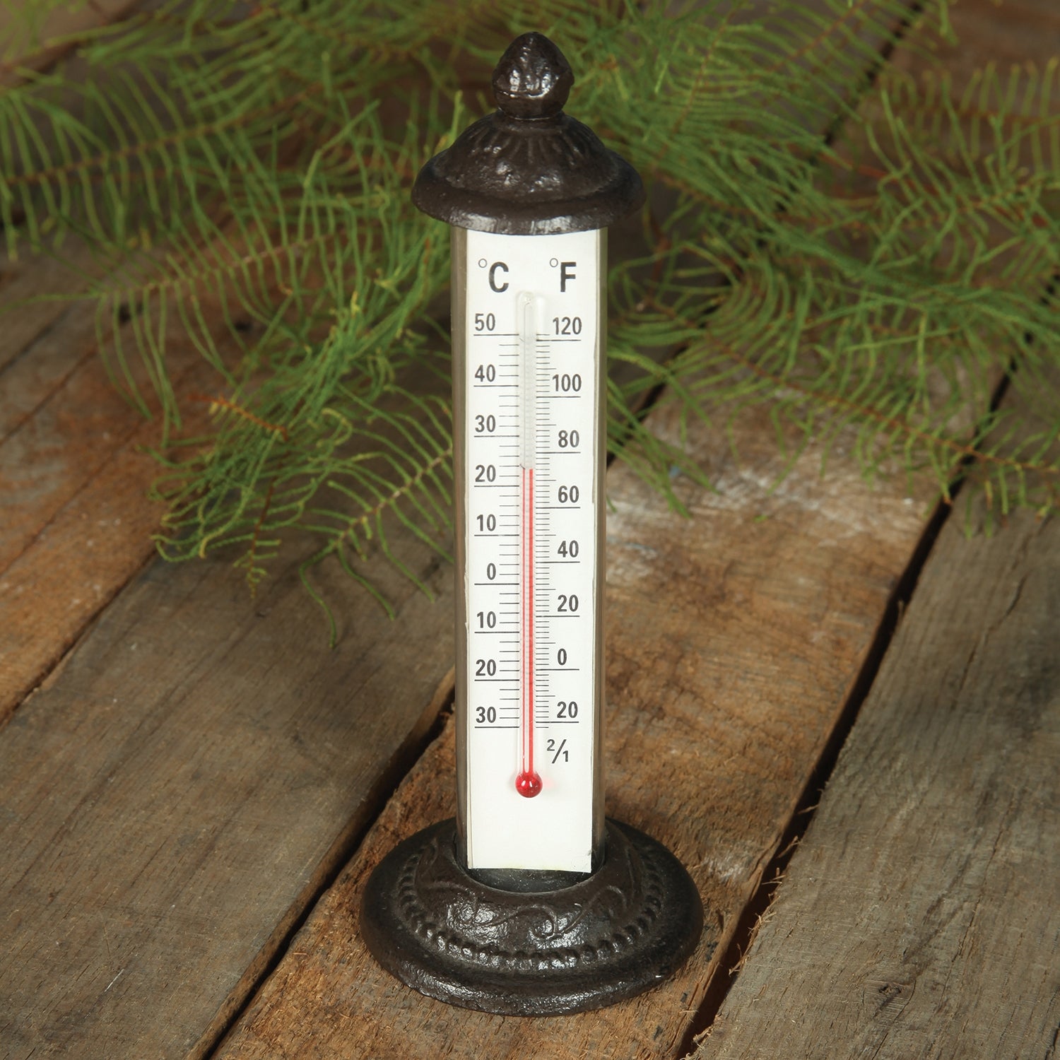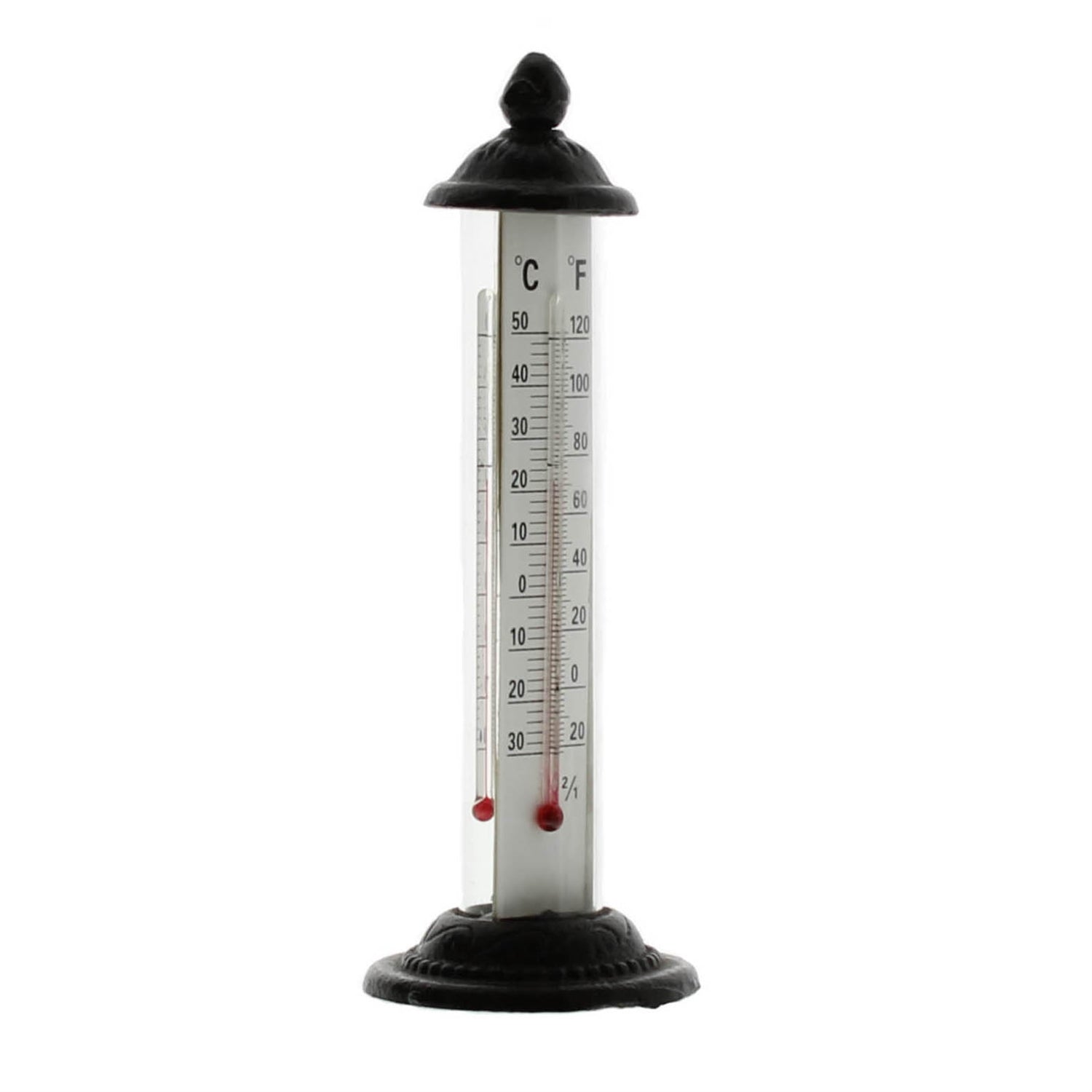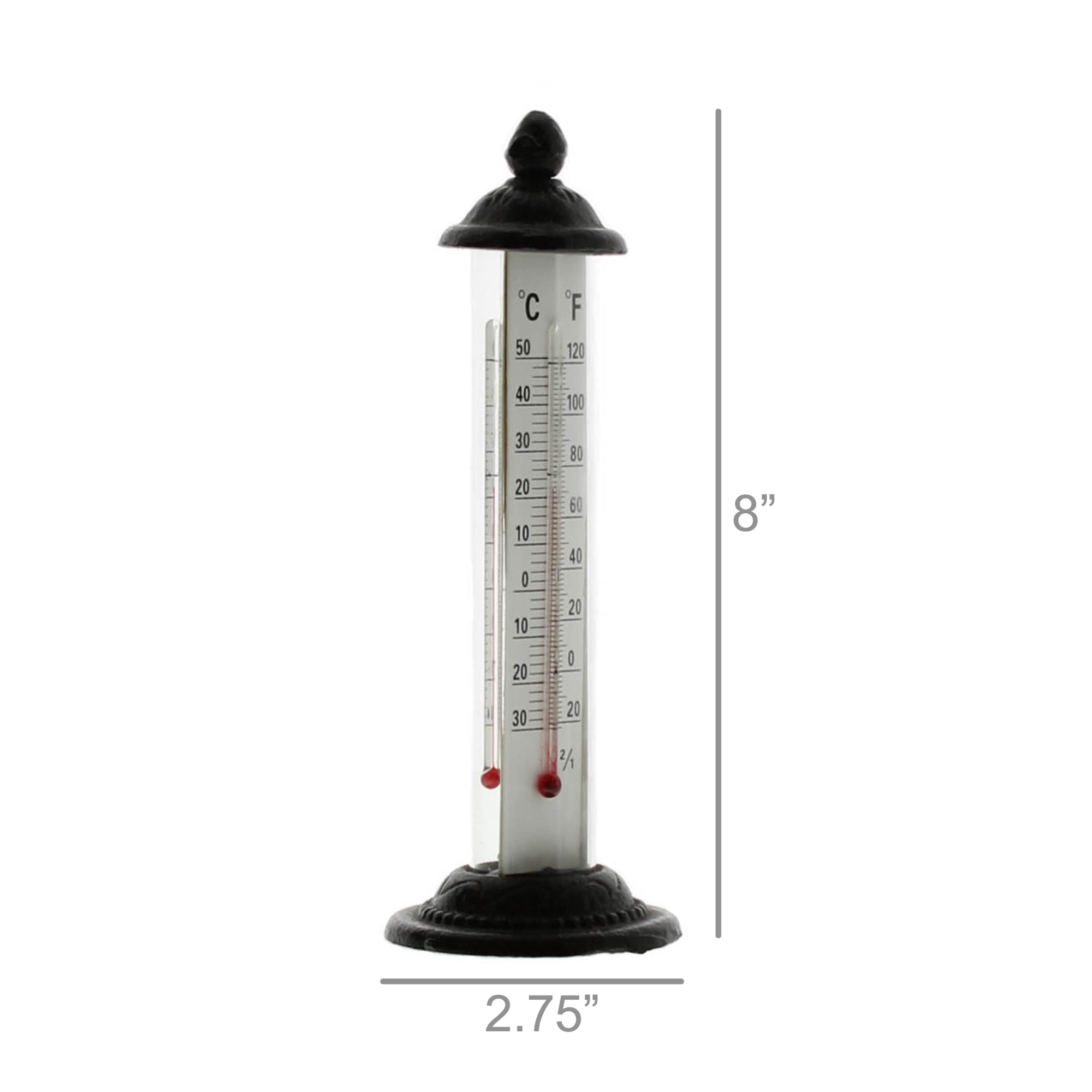 This outdoor thermometer flawlessly marries function with style; encased in a cast iron frame the glass-protected thermometer indicates the temperature in both Fahrenheit and Celsius. Wipe with dry cloth, Windex