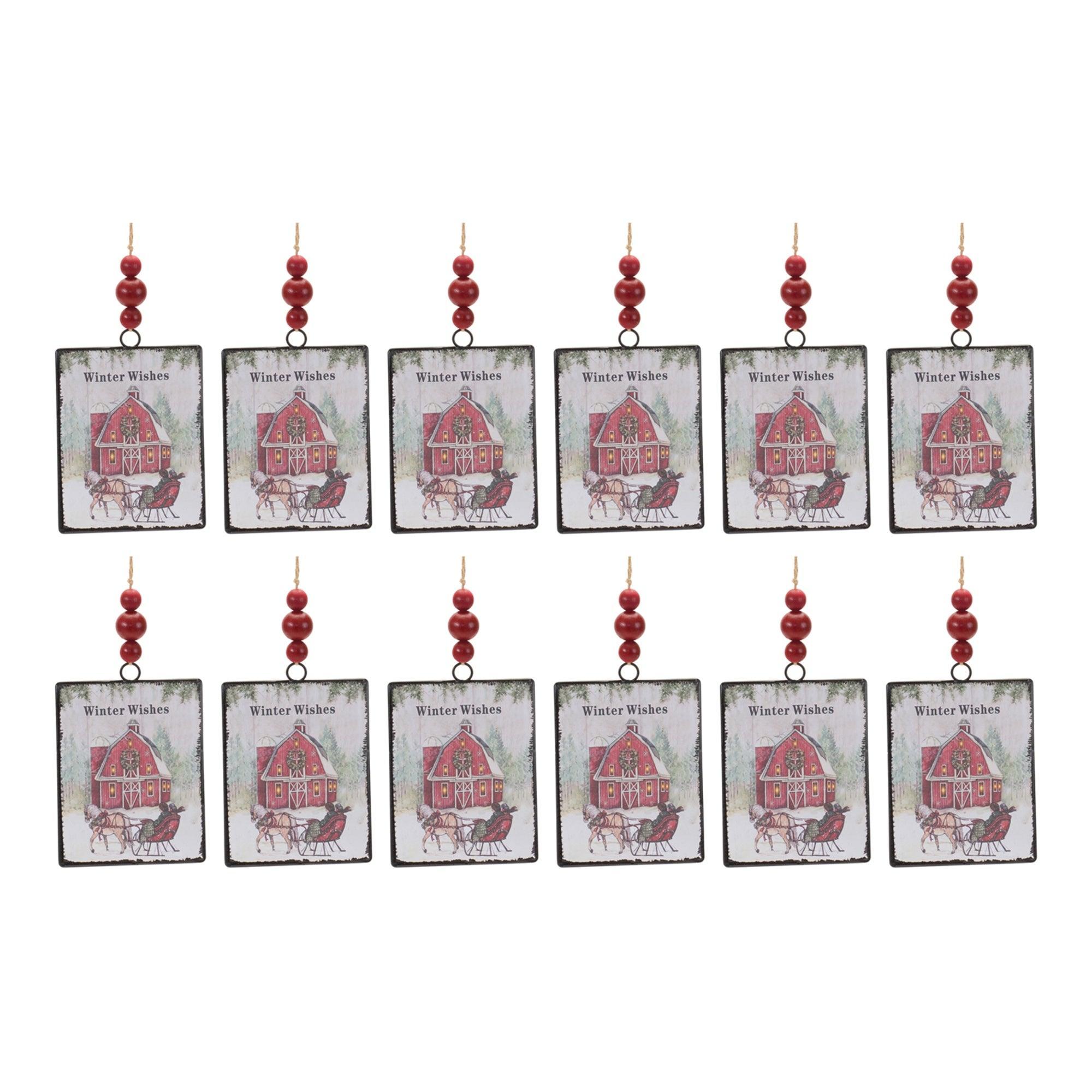 Add a rustic touch to your Christmas Tree with this beautiful set of Winter Wishes Barn Couple Ornaments. Featuring 12 pieces, this set's festive red and green tones, rustic painted barn and horse carriage couple design, and wood bead accents are the perfect combination to create a memorable display. The quality glass composition with delicate jute string hanger is sure to endure for seasons to come. Whether you're adding a touch of cheer to your home or gifting to a loved one, these ornaments will definitely bring smiles to your home.