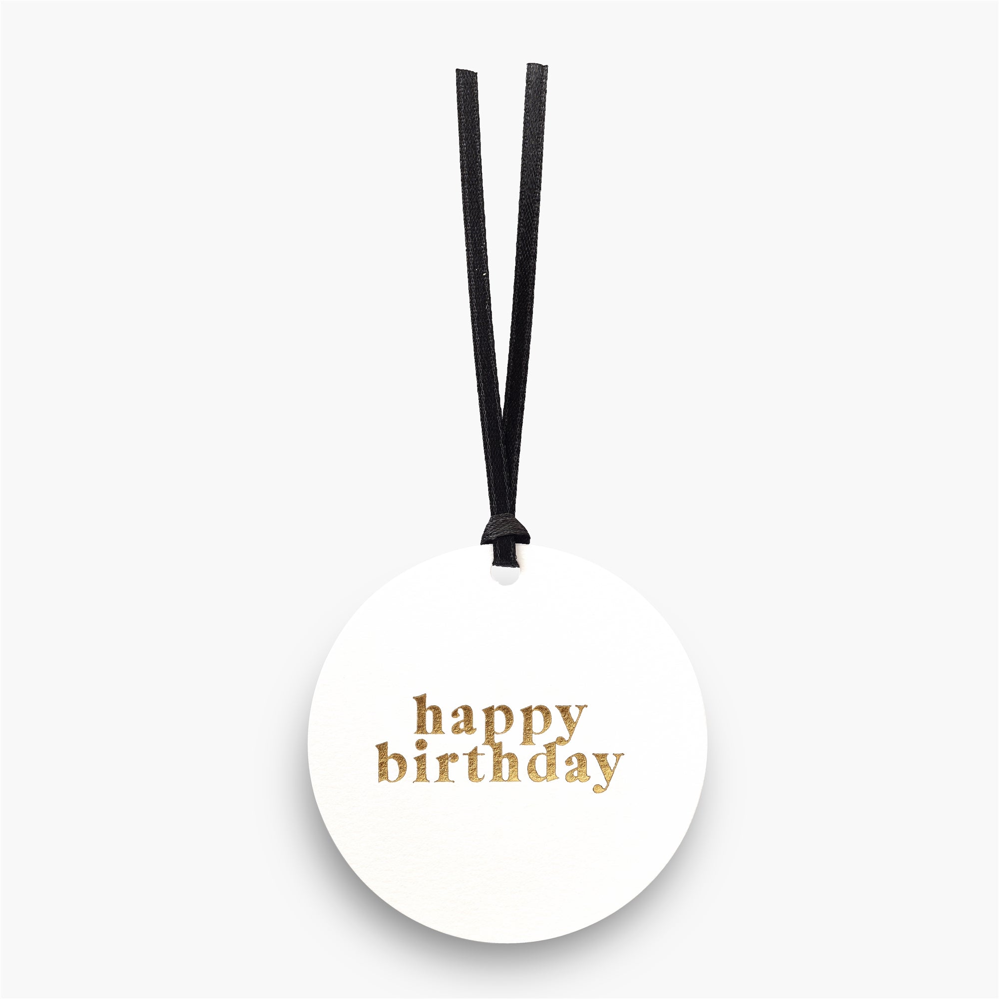 Circular gift tags offer gold foil letterpress expressions on brilliant white 184 lb cotton cardstock with attached black ribbon. Packaged Individually.