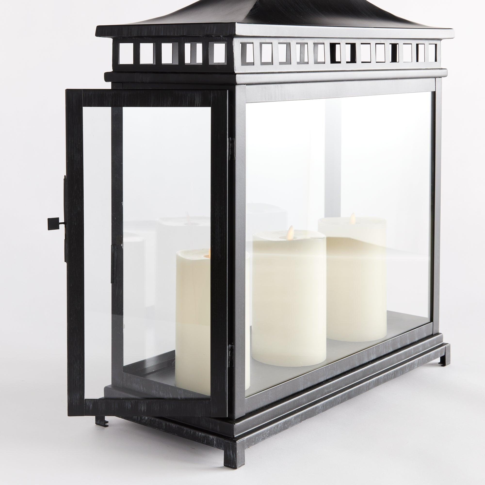 Simple in form and designed with a wide, sweeping top and a row of panes, this lantern is full of character. The powder-coated washed black finish gives it a sleek look that works well in any outdoor setting.