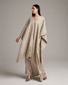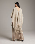 Luxurious, long, manta hand-loomed in decorated Italian yarn. A structured and dramatic layer.