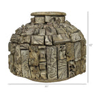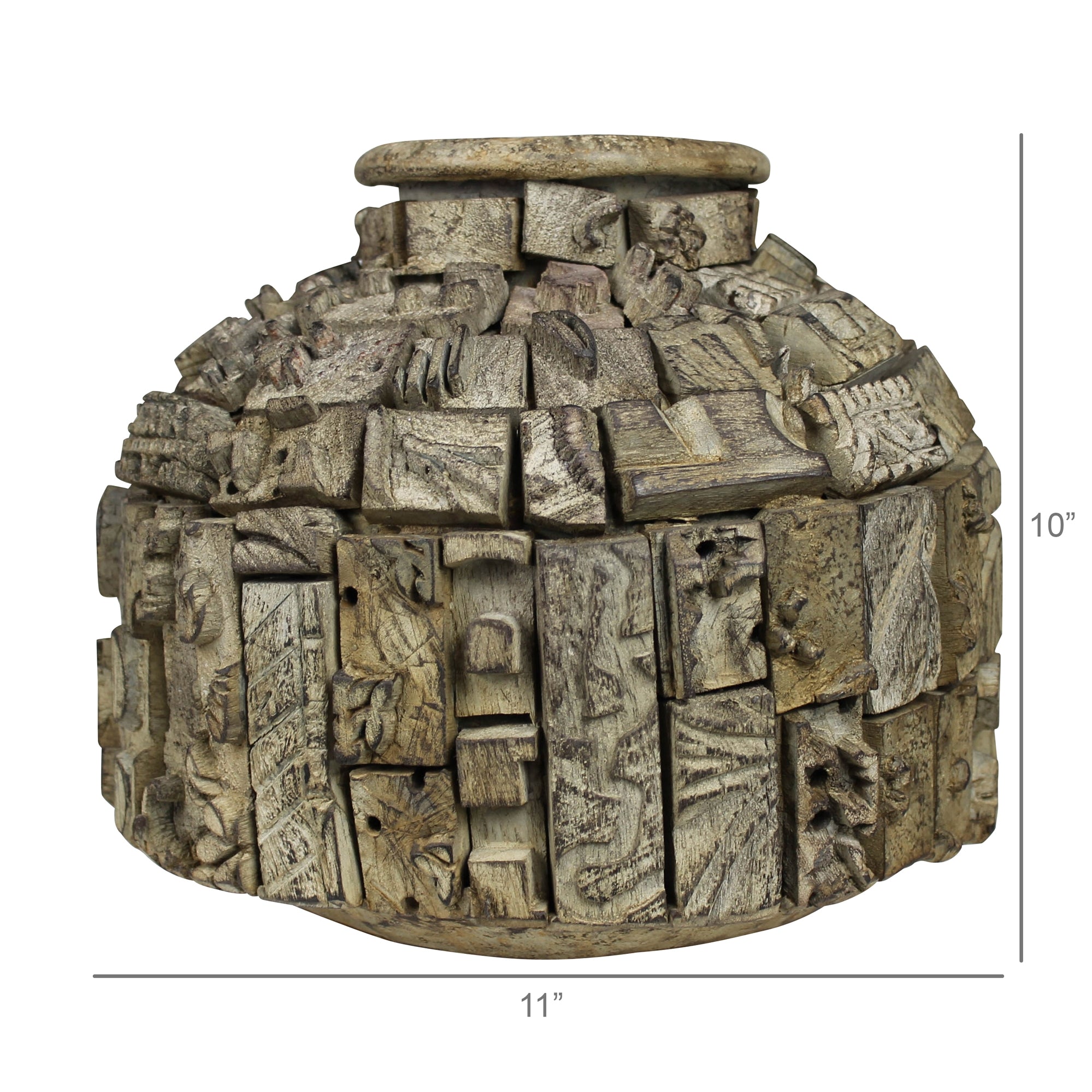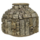 A vintage metal vessel once used for carrying water is given a decorative update enrobed in wood block prints. These two salvage materials combine to make a striking object. Not water tight. Each piece is unique, the shape and pattern will vary.