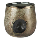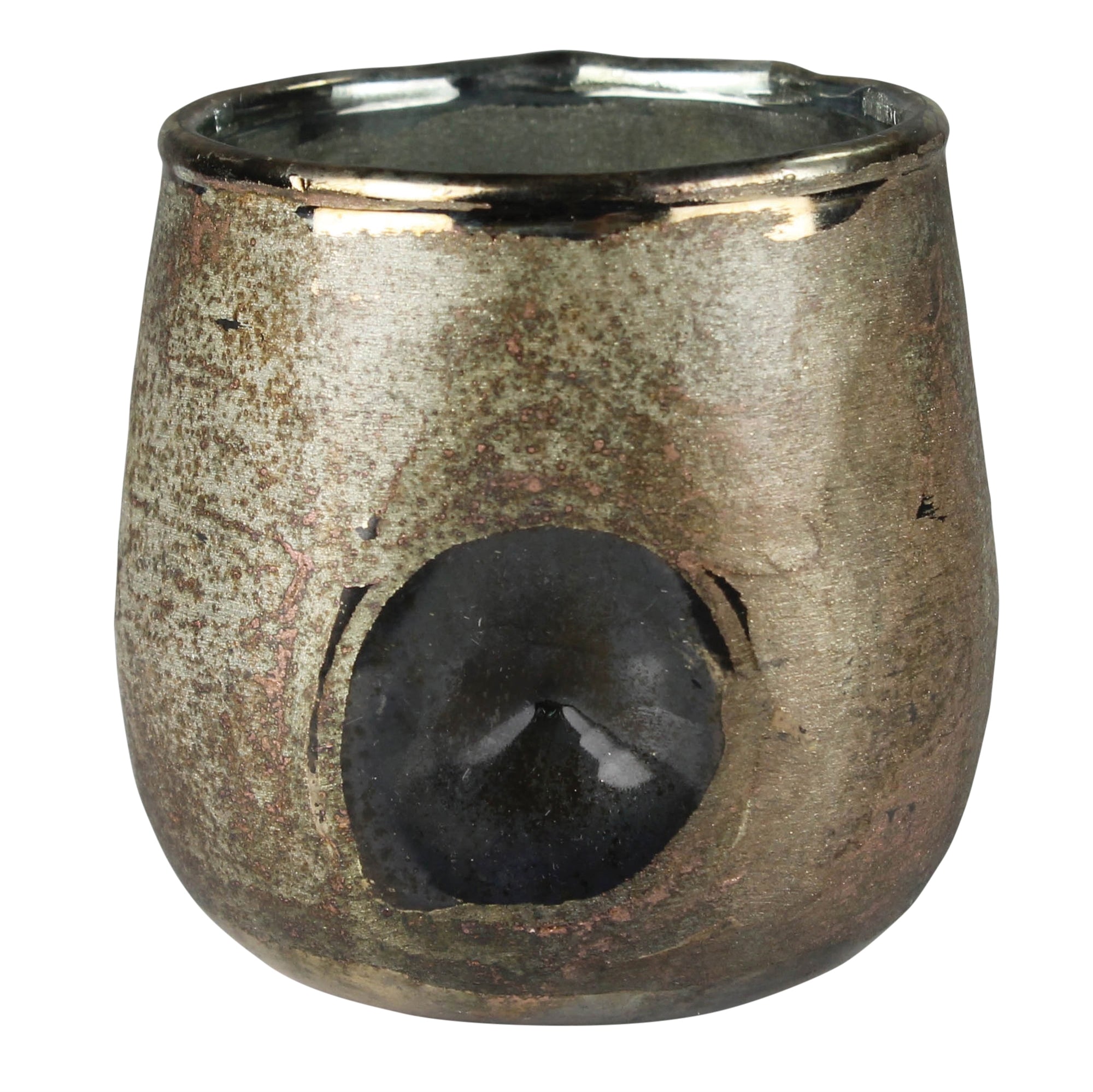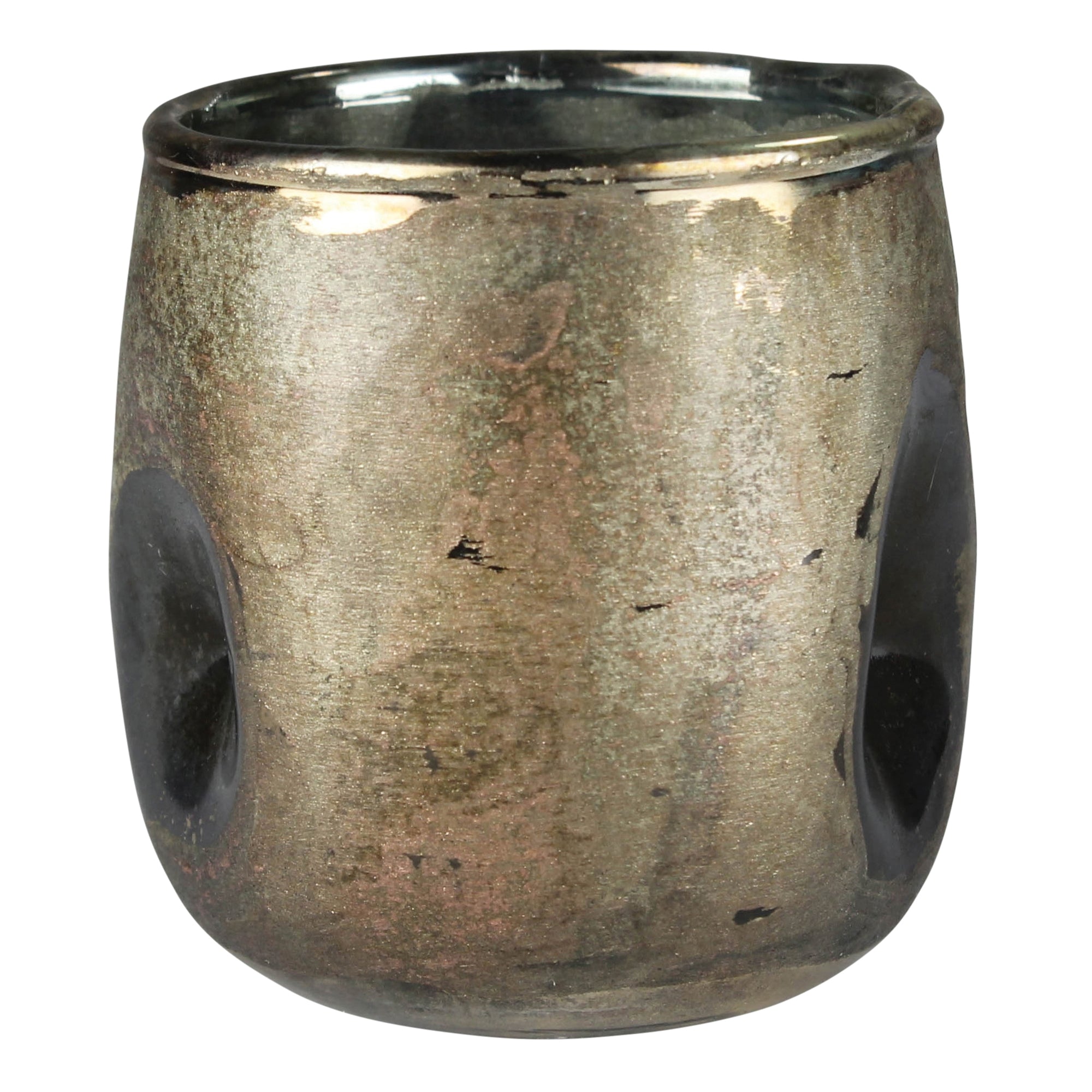 A thick blown glass votive with three indents is given an antiqued silver finish creating a candleholder that emits a warm candlelit glow.